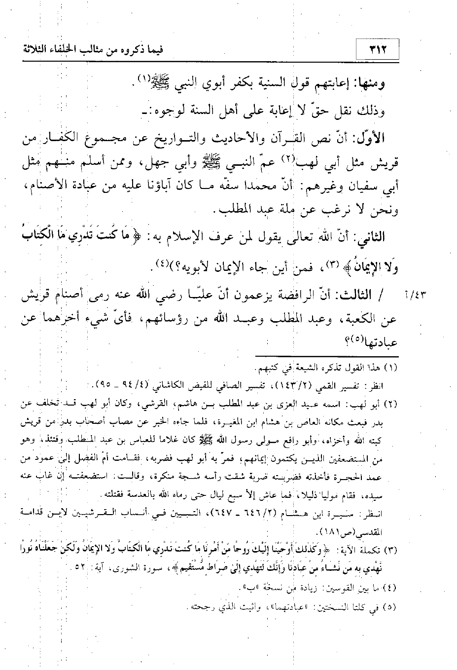 الأول أن نص القرآن والأحاديث والتواريخ عن مجموع الكفار مثل أبي لهب عم النبي - صلى الله عليه وسلم - وأبي جهل وممن أسلم منهم مثل أبي سفيان وغيرهم أن محمد سفّه ما كان آباؤنا عليه من عبادة الأصنام ونحن لا نرغب عن ملة عبد المطلب.