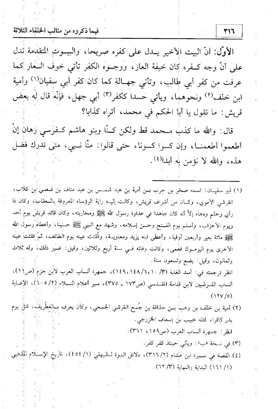 الأول أن البيت الأخير يدل على كفره صريحا، والبيوت المتقدمة تدل على أن وجه الكفر كان خيفة العار. ووجوه الكفر تأتي خوف العار كما عرفت من كفر أبي طالب، وتأتي جهالة كما كان كفر أبي سفيان وأمية بن خلف ونحوهما، وتأتي حسدا ككفر أبي جهل، فإنه قال له أحد قريش: ما تقول أبا الحكم في محمد، أتراه كاذبا؟ قال: والله ما كذب محمد قط ولكن كنا وبنو هاشم كفرسي رهان إن أطعموا أطعمنا وإن كسوا كسونا حتى قالوا الآن: منا نبي، متى ندرك فضل هذه، والله لا نؤمن به أبدا.