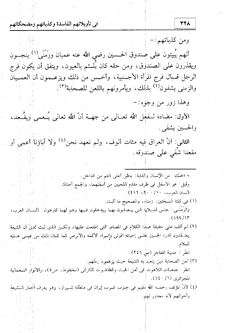 ومن كذباتهم أنهم يبيتون على صندوق الحسين رضي الله عنه عميانا وزمنى ينجسون ويقذرون على الصندوق، ومن حقه كان يلثم بالعيون. ويتفق أن يكون فرج الرجل قبل فرج المرأة الأجنبية وأخس من ذلك. ويزعمون أن العميان والزمنى يشفون بذلك. ويأمرونهم باللعن للصحابة.
