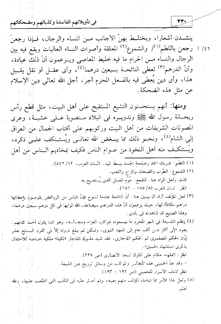 ينشدن أشعار ويختلط بهن الأجانب من الرجال والنساء. فإذا رجعن رجعن باللطم والشموع المعلقة وأصوات النساء العاليات. ويقع فيه بين الرجال والنساء من الحرام ما فيه غليظ المعاصي. ويزعمون أن ذلك عبادة وأن الدرهم الذي تعطى النائحة بسبعين درهما. وأي عقل أو نقل يقبل هذا، وأي دين يعطى فيه بالفعل المحرم أجر؟ أجل الله تعالى دين الإسلام عن مثل هذه الضحكة.