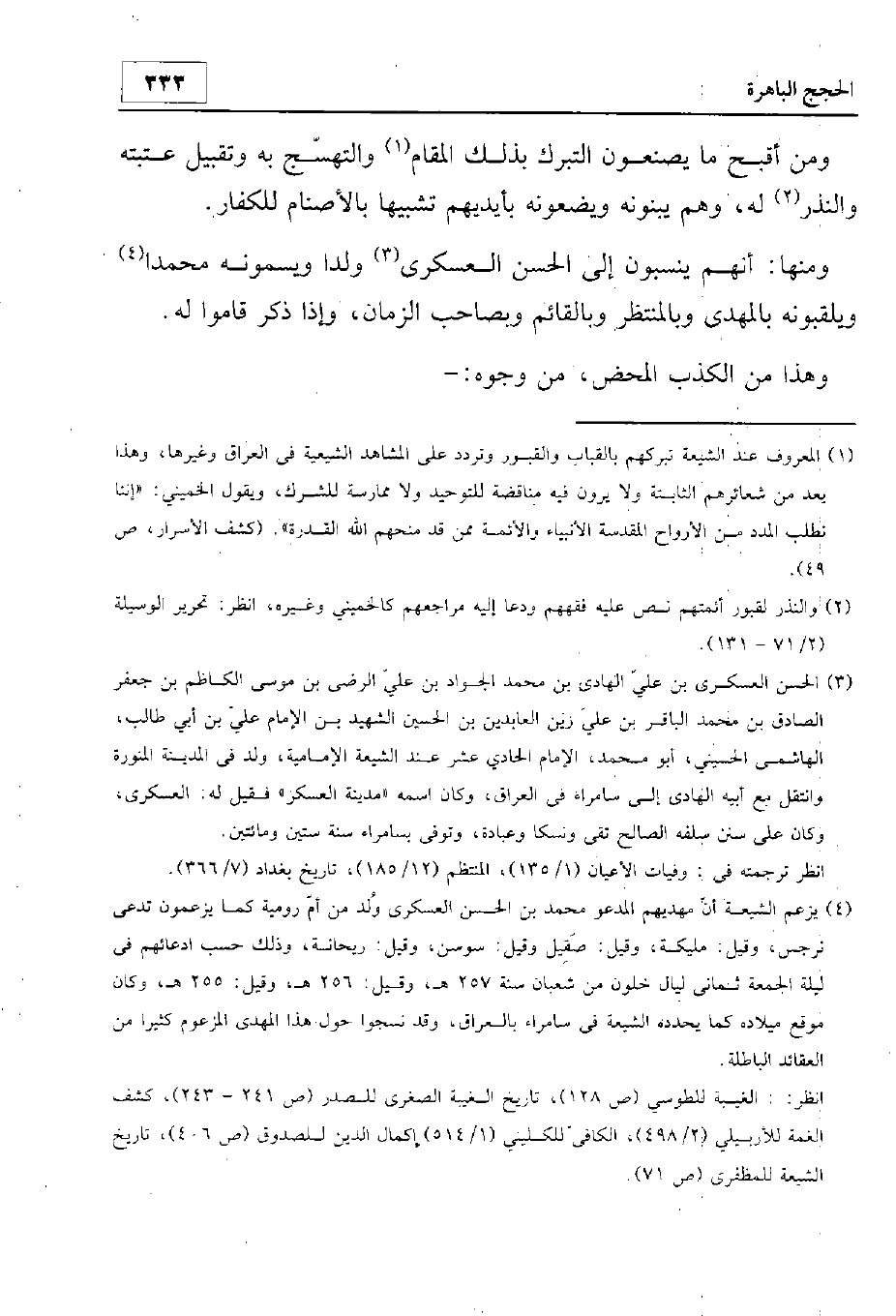 ومنها أنهم ينسبون إلى الحسن العسكري ولدا ويسمونه محمدا ويلقبونه بالمهدي وبالمنتظر وبالقائم وبصاحب الزمان. وإذا ذكر قاموا له.