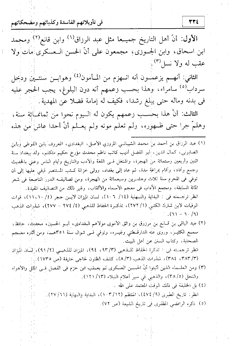 الأول أن أهل التاريخ جميعا، مثل عبد الرزاق وابن قانع ومحمد بن إسحاق وابن الجوزي، مجمعون على أن الحسن العسكري مات ولا عقب له ولا نسل.