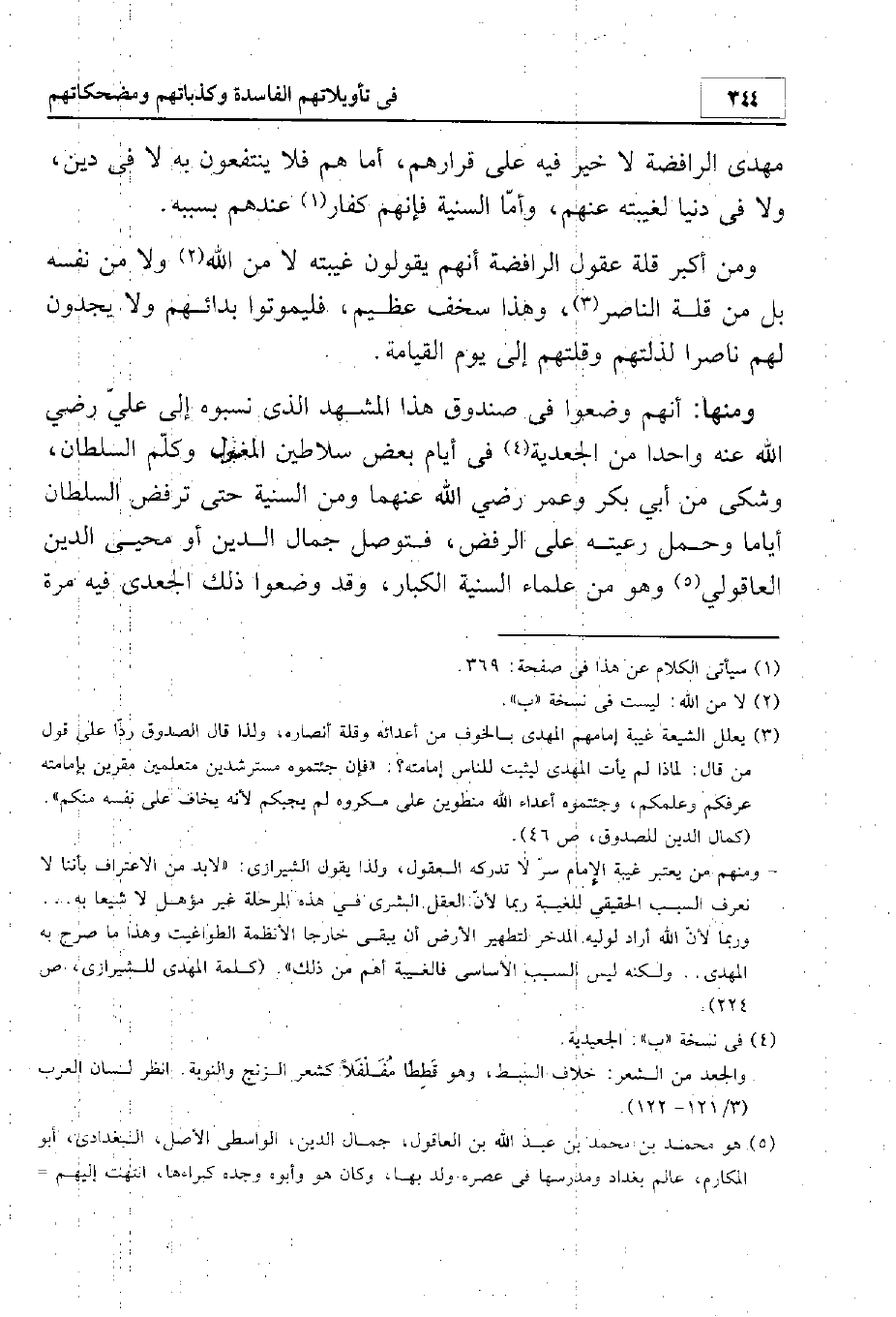 مهدي الرافضة لا خير فيه على قرارهم: أما هم فلا ينتفعون به لا في دين ولا في دنيا لغيبته عنهم، وأما السنية فإنهم كفار عندهم بسببه. ومن أكبر قلة عقول الرافضة أنهم يقولون غيبته لا من الله ولا من نفسه بل من قلة الناصر. وهذا سخف عظيم. فليموتوا بدائهم ولا يجدون لهم ناصرا ولذلتهم وقلتهم إلى يوم القيامة.