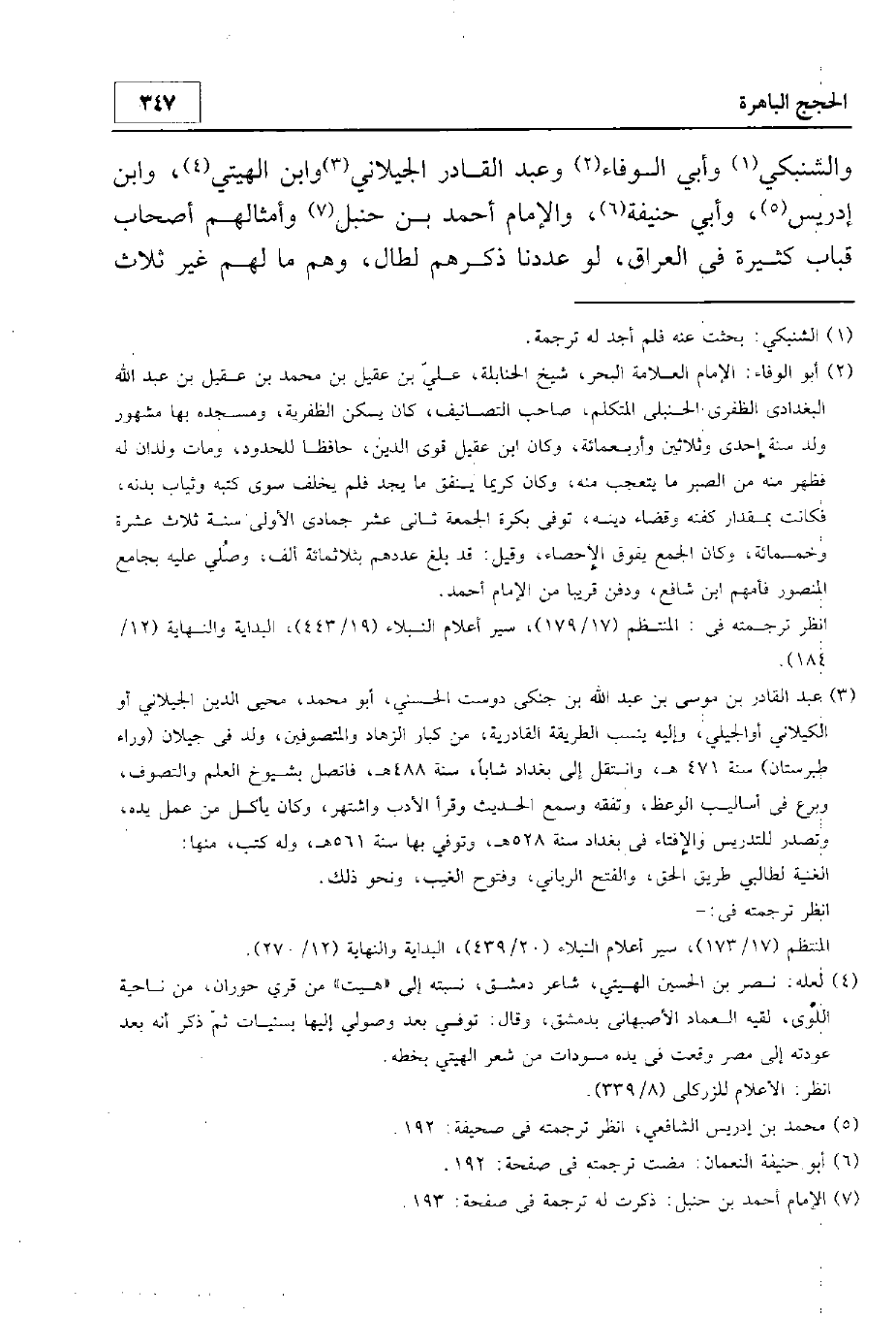 والشنبكي وأبي الوفاء وعبد القادر الجيلاني وابن الهيتي وابن إدريس وأبي حنيفة والإمام أحمد بن حنبل. وأمثالهم أصحاب قباب كثيرة في العراق لو عددنا ذكرهم لطال. وهم ما لهم غير ثلاث