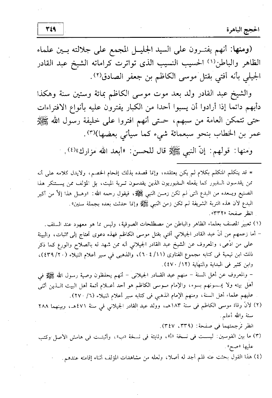 ومنها أنهم يفترون على السيد الجليل المجمع على جلالته بين علماء الظاهر والباطن الحسيب النسيب الذي تواترت كراماته الشيخ عبد القادر الجيلي بأنه أفتى بقتل موسى الكاظم بن جعفر الصادق. والشيخ عبد القادر ولد بعد موت موسى الكاظم بمائة وستين سنة. وهكذا دأبهم دائما إذا أرادوا أن يسبوا أحدا من الكبار يفترون عليه بأنواء الافتراءات حتى تتمكن العامة من سبهم، حتى أنهم افتروا على خليفة رسول الله - صلى الله عليه وسلم - عمر بن الخطاب بنحو سبعمائة شيء كما سيأتي بعضها.