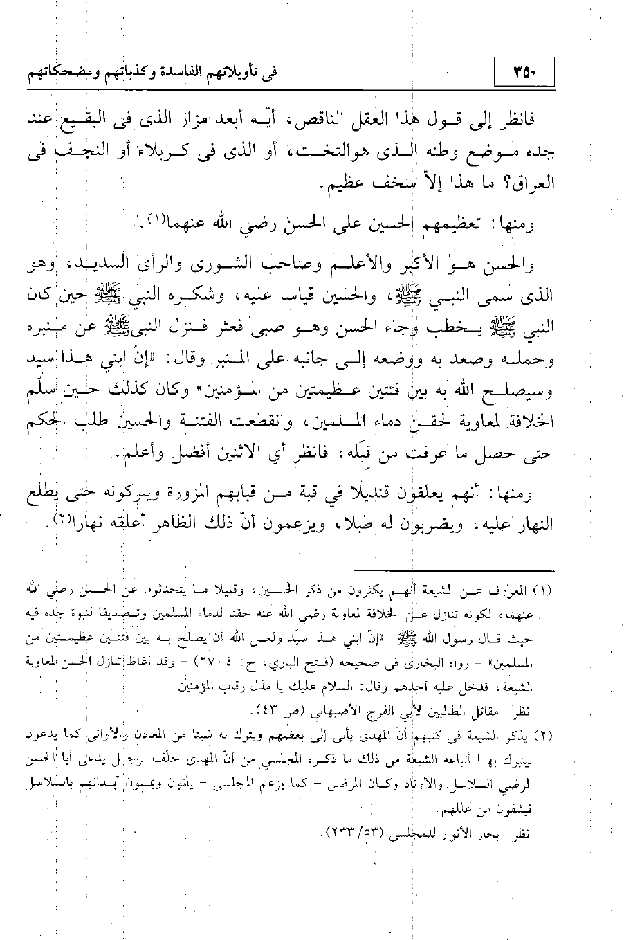 فانظر إلى قول هذا العقل الناقص، أيه أبعد، مزار الذي في البقيع عند جده موضع وطنه الذي هو التخت، أو الذي في كربلاء أو النجف في العراق؟ ما هذا إلا سخف عظيم.