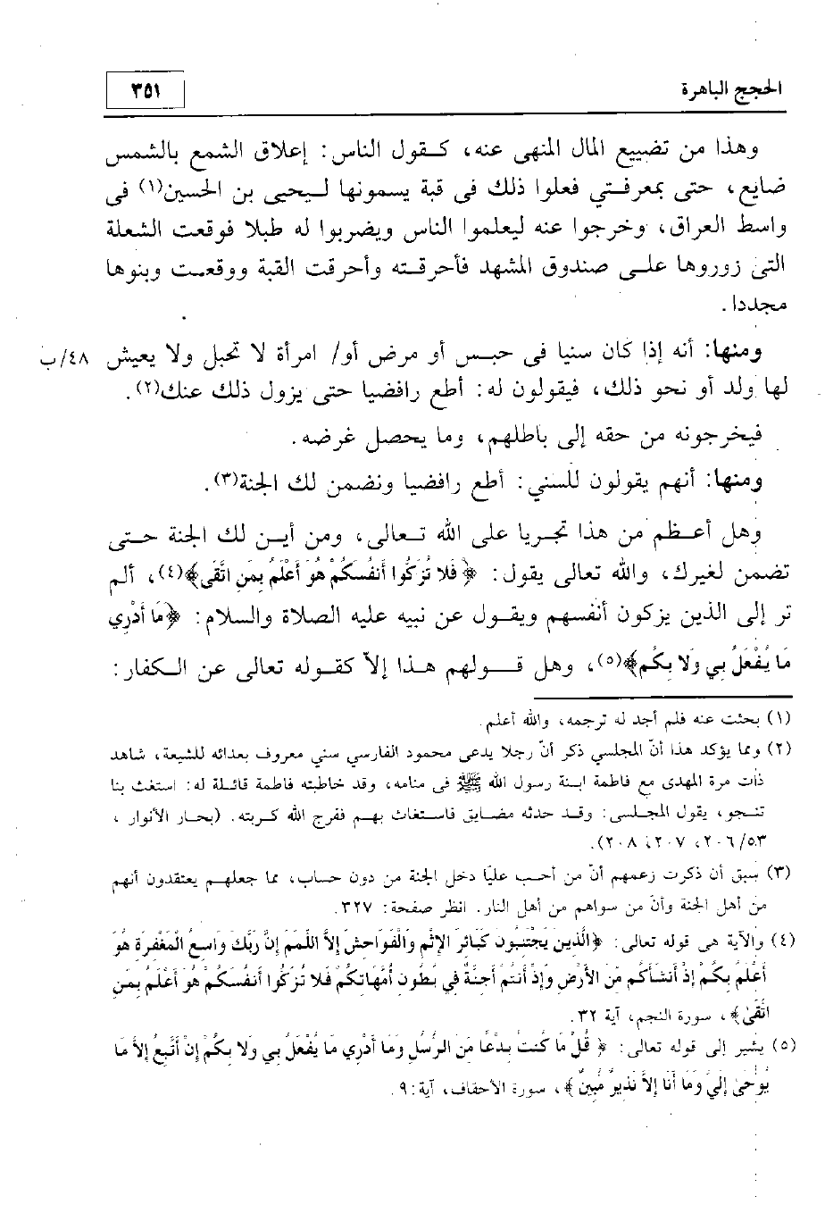 ومنها أنهم يقولون للسني: أطع رافضيا ونضمن لك الجنة. وهل أعظم من هذا تجرؤا على الله تعالى. ومن أين لك الجنة حتى تضمن لغيرك، والله تعالى يقول: {فَلَا تُزَكُّوا أَنْفُسَكُمْ هُوَ أَعْلَمُ بِمَنِ اتَّقَى}، {أَلَمْ تَرَ إِلَى الَّذِينَ يُزَكُّونَ أَنْفُسَهُمْ} ويقول عن نبيه عليه الصلاة والسلام: {وَمَا أَدْرِي مَا يُفْعَلُ بِي وَلَا بِكُمْ} وهل قولهم هذا إلا كقوله تعالى عن الكفار: