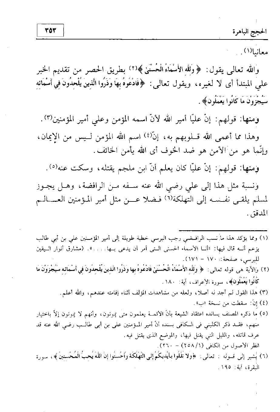 ومنها قولهم إن عليا أمير الله لأن اسمه المؤمن وعلي أمير المؤمنين. وهذا مما أعمى الله قلوبهم به، إذ اسم الله المؤمن ليس من الإيمان وإنما هو من الأمن، هو ضد الخوف، أي الله يؤمن الخائف.