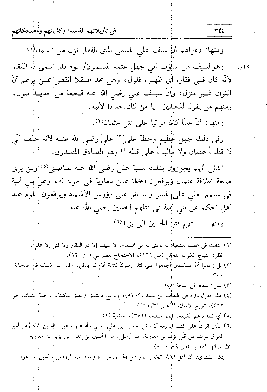 ومنها دعواهم أن سيف علي المسمى بذي الفقار نزل من السماء. وهو سيف من سيوف أبي جهل، غنمته المسلمون يوم بدر. سمي ذا الفقار لأنه كان في فقاره، أي ظهره، فلول. وهل تجد عقلا أنقص ممن يزعم أن القرآن غير منزل وأن سيف علي رضي الله عنه -قطعة من حديد- منزل. ومنهم من يقول للحسين: يا من كان الله حدادا لأبيه.