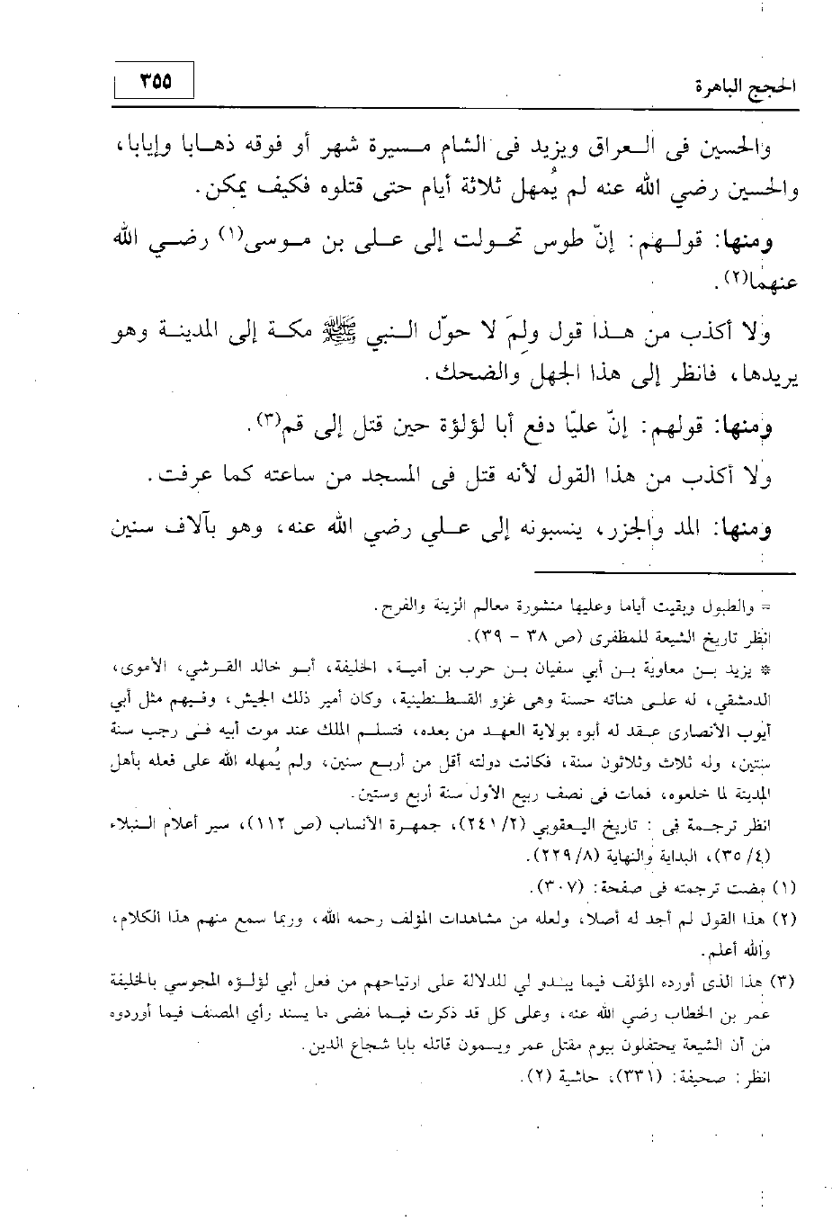 ومنها قولهم إن طوس تحولت إلى علي بن موسى رضي الله عنهما. ولا أكذب من هذا قول. ولم لا حوّل النبي - صلى الله عليه وسلم - مكة إلى المدينة وهو يريدها. فانظر إلى هذا الجهل والضحك.