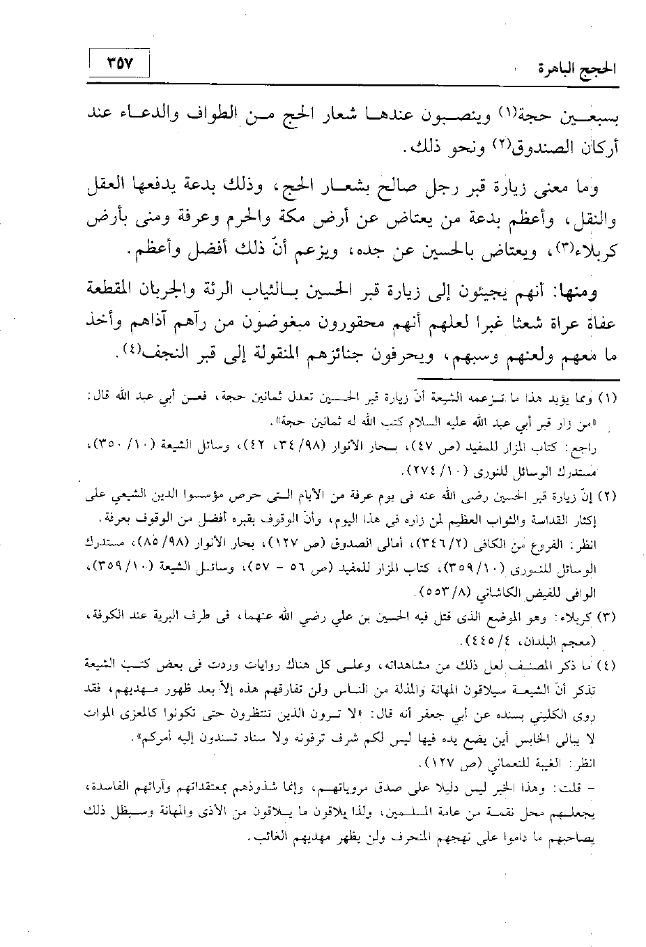 بسبعين حجة. وينصبون عندها شعار الحج من الطواف والدعاء عند أركان الصندوق ونحو ذلك. وما معنى زيارة قبر رجل صالح بشعار الحج؟ وذلك بدعة يدفعها العقل والنقل. وأعظم بدعة من يعتاض عن أرض مكة والحرم وعرفة ومنى بأرض كربلاء، ويعتاض بالحسين عن جده، ويزعم أن ذلك أفضل وأعظم.