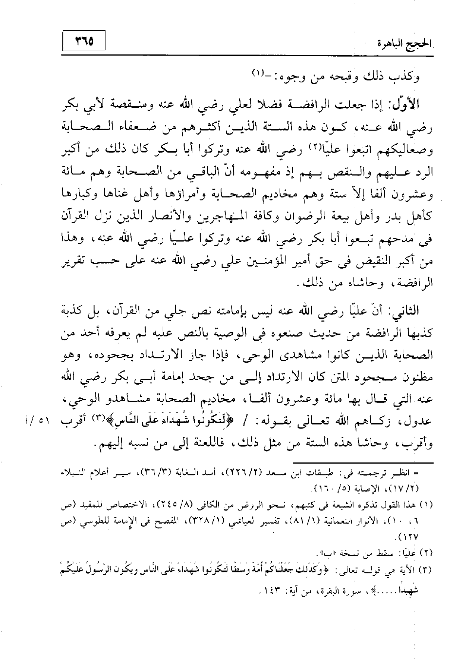 الثاني أن عليا رضي الله عنه ليس بإمامته نص جلي من القرآن، بل كذبة كذبها الرافضة من حديث صنعوه في الوصية بالنص عليه لم يعرفه أحد من الصحابة الذين كانوا مشاهدي الوحي. فإذا جاز الارتداد بجحوده وهو مظنون مجحود المتن، كان الارتداد إلى من جحد إمامة أبي بكر رضي الله عنه التي قال بها مائة وعشرون ألفا، مخاديم الصحابة مشاهدو الوحي عدول زكاهم الله تعالى بقوله: {لِتَكُونُوا شُهَدَاءَ عَلَى النَّاسِ} أقرب وأقرب. وحاشا هذه الستة من مثل ذلك. فاللعنة إلى من نسبه إليهم.