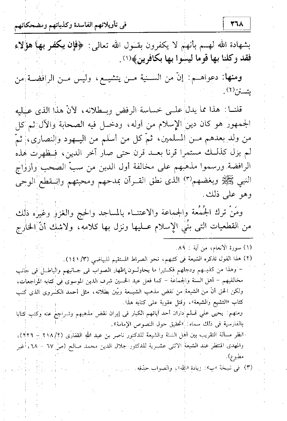 قلنا: هذا مما يدل على خساسة الرفض وبطلانه، لأن هذا الذي عليه الجمهور هو كان دين الإسلام من أوله، ودخل فيه الصحابة والآل ثم كل من ولد بعدهم من المسلمين ثم كل من أسلم من اليهود والنصارى. ثم لم يزل كذلك مستمرا قرنا بعد قرن حتى صار آخر الدين، فظهرت هذه الرافضة ورسموا مذهبهم على مخالفة أول الدين، من سب الصحب وأزواج النبي - صلى الله عليه وسلم - وبغضهم، الذي نطق القرآن بمدحهم ومحبتهم وانقطع الوحي وهو على ذلك، ومن ترك الجمعة والجماعة والاعتناء بالمساجد والحج والغزو وغير ذلك من القطعيات التي بني الإسلام عليها ونزل بها كلامه. ولا شك أن الخارج