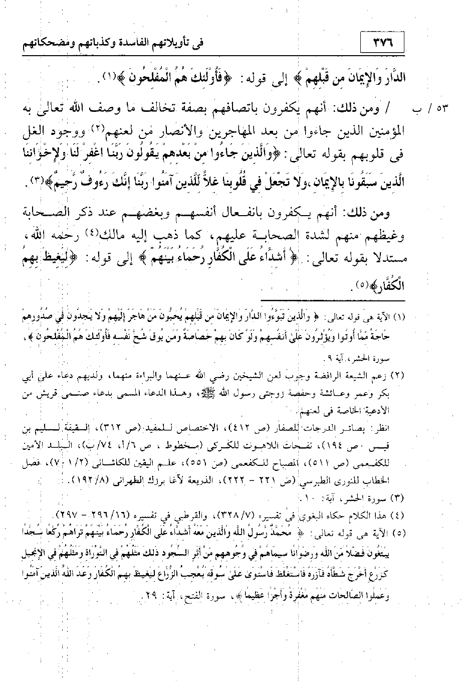 ومن ذلك أنهم يكفرون باتصافهم بصفة تخالف ما وصف الله تعالى به المؤمنين الذين جاءوا من بعد المهاجرين والأنصار -من لعنهم ووجود الغل في قلوبهم- بقوله تعالى: {وَالَّذِينَ جَاءُوا مِنْ بَعْدِهِمْ يَقُولُونَ رَبَّنَا اغْفِرْ لَنَا وَلِإِخْوَانِنَا الَّذِينَ سَبَقُونَا بِالْإِيمَانِ وَلَا تَجْعَلْ فِي قُلُوبِنَا غِلًّا لِلَّذِينَ آَمَنُوا رَبَّنَا إِنَّكَ رَءُوفٌ رَحِيمٌ}