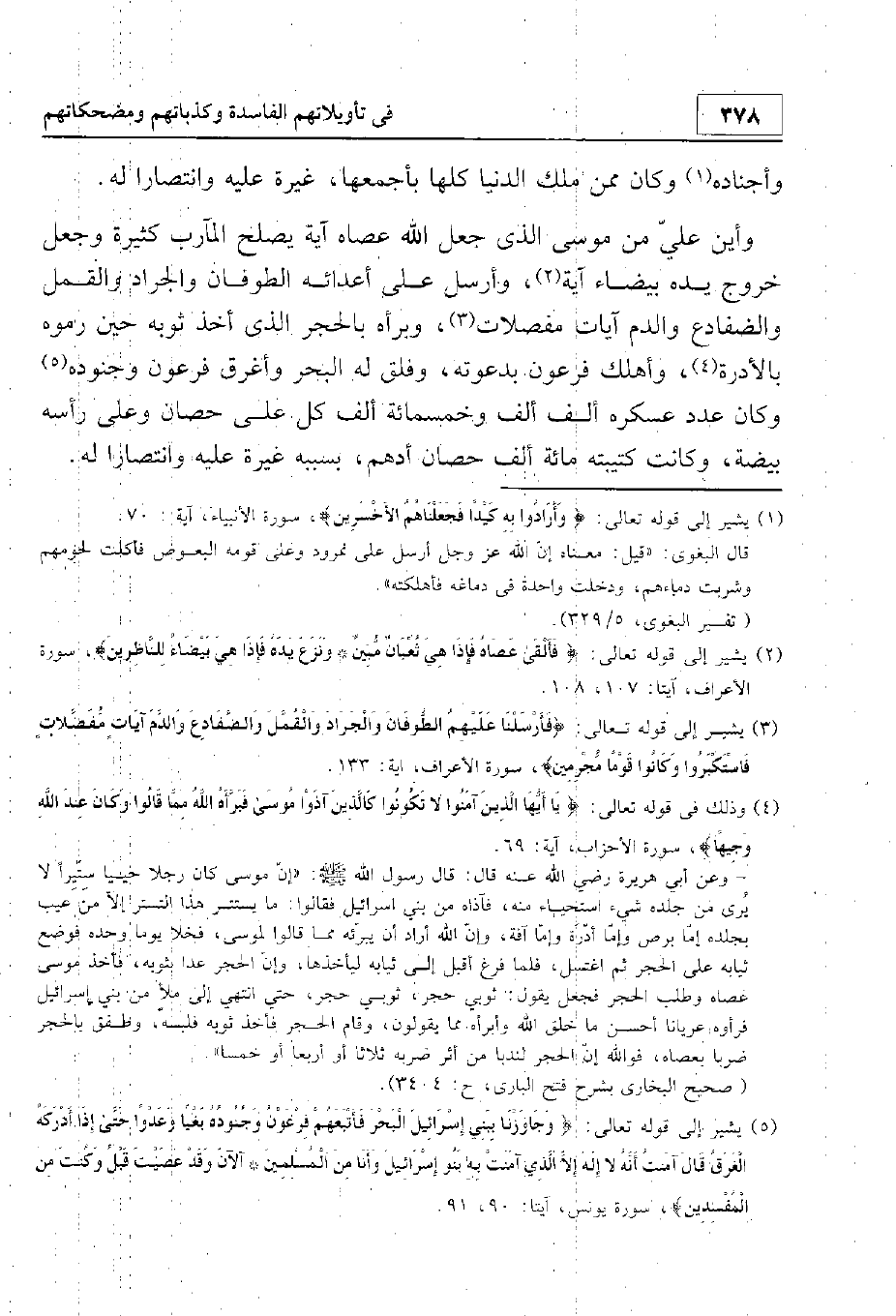 وأجناده وكان ممن ملك الدنيا كلها بأجمعها، غيرة عليه وانتصار له. وأين علي من موسى الذي جعل الله عصاه آية تصلح لمآرب كثيرة وجعل خروج يده بيضاء آية، وأرسل على أعدائه {الطُّوفَانَ وَالْجَرَادَ وَالْقُمَّلَ وَالضَّفَادِعَ وَالدَّمَ آَيَاتٍ مُفَصَّلَاتٍ}، وبرأه بالحجر الذي أخذ ثوبه حين رموه بالأدرة، وأهلك فرعون بدعوته، وفلق له البحر وأغرق فرعون وجنوده -وكان عدد عسكره ألف ألف وخمسمائة ألف، كل على حصان وعلى رأسه بيضة، وكانت كتيبته مائة ألف حصان أدهم- بسببه غيرة عليه وانتصارا له.