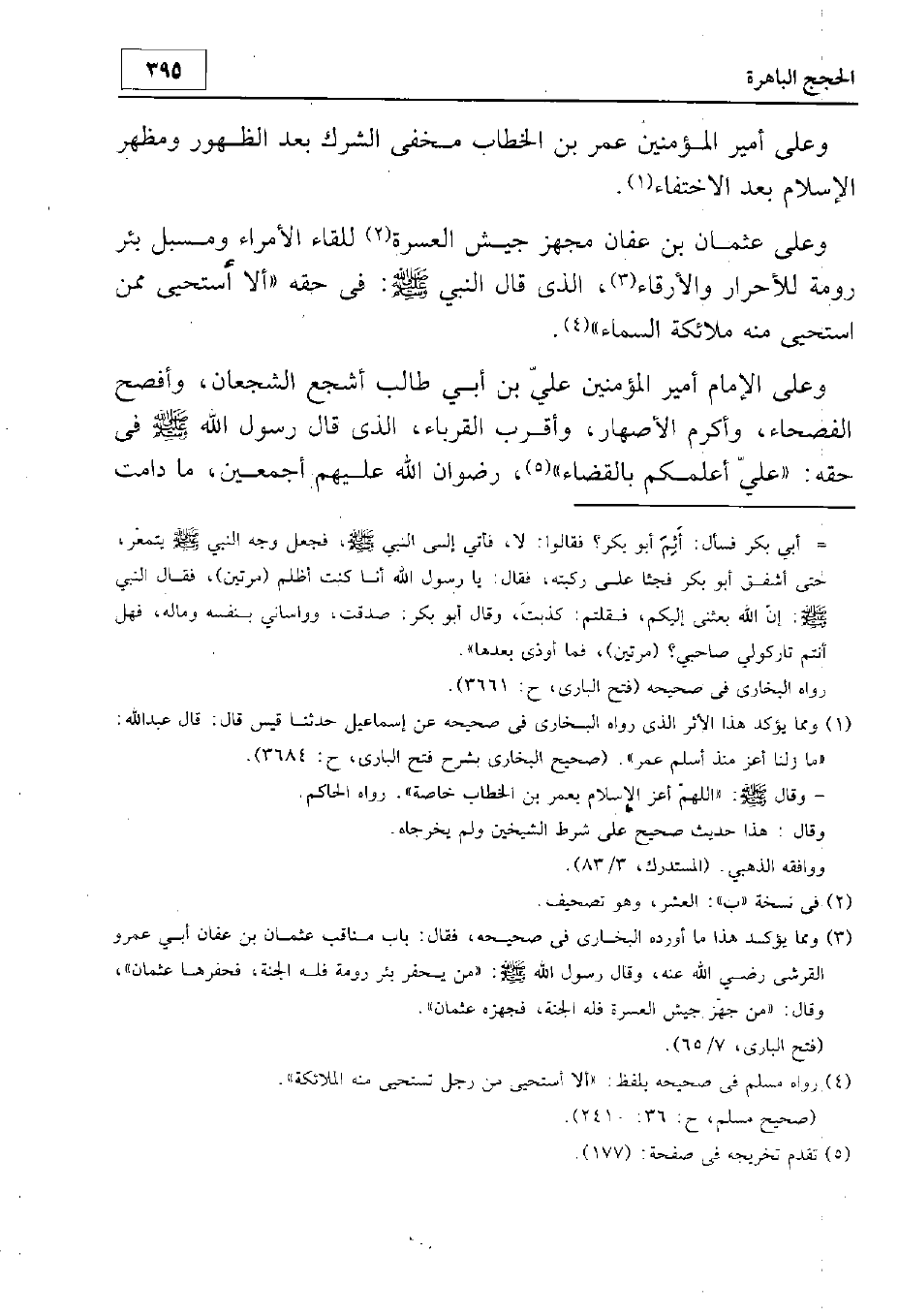 على أمير المؤمنين عمر بن الخطاب مخفي الشرك بعد الظهور ومظهر الإسلام بعد الاختفاء وعلى عثمان بن عفان مجهز جيش العسرة للقاء الأعداء ومسبل بئر رومة للأحرار والأرقاء الذي قال النبي - صلى الله عليه وسلم - في حقه: "ألا أستحي ممن استحت منه ملائكة السماء" وعلى الإمام أمير المؤمنين علي بن أبي طالب أشجع الشجعان وأفصح الفصحاء وأكرم الأصهار وأقرب القرباء الذي قال رسول الله - صلى الله عليه وسلم - في حقه: "علي أعلمكم بالقضاء" رضوان الله عليه ما دامت الأرض والسماء".
