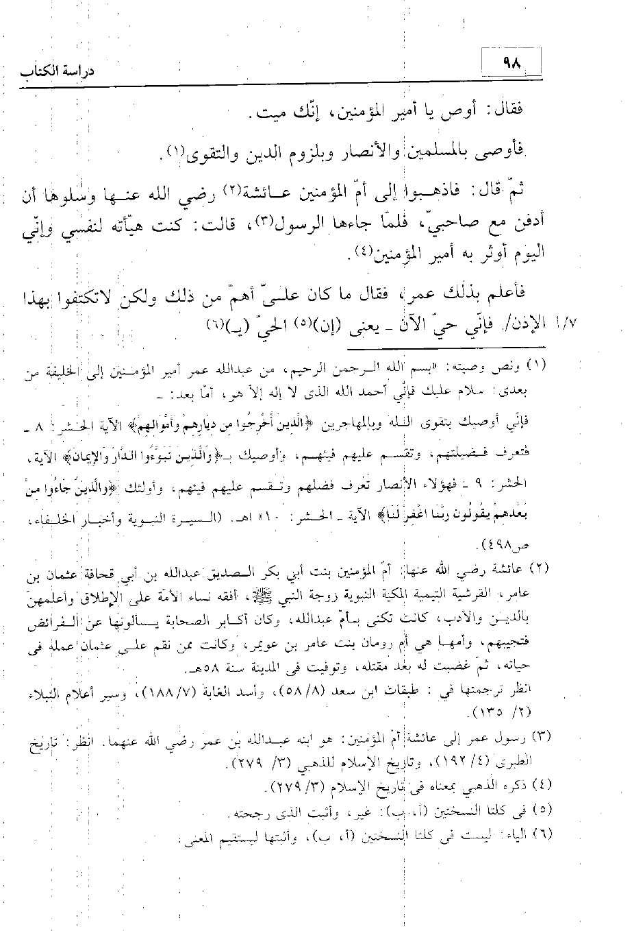 فقال: أوص يا أمير المؤمنين، إنك ميت. فأوصى بالمسلمين والأنصار وبلزوم الدين والتقوى؛ ثم قال: فاذهبوا إلى أم المؤمنين عائشة رضي الله عنها وسلوها أن أدفن مع صاحبيّ. فلما جاءها الرسول قالت: كنت هيأته لنفسي، وإني اليوم أوثر به أمير المؤمنين. فأعلم بذلك عمر، فقال: ما كان علي أهم من ذلك، ولكن لا تكتفوا بهذا الإذن فإني حي الآن -يعني عين الحي