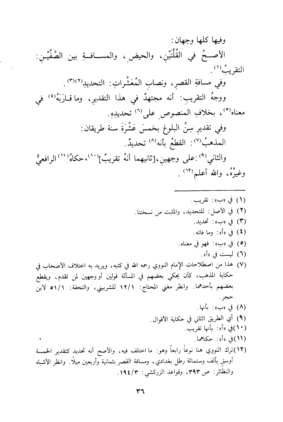 الاصح فِي الْقلَّتَيْنِ وَالْحيض والمسافة بَين الصفين التَّقْرِيب