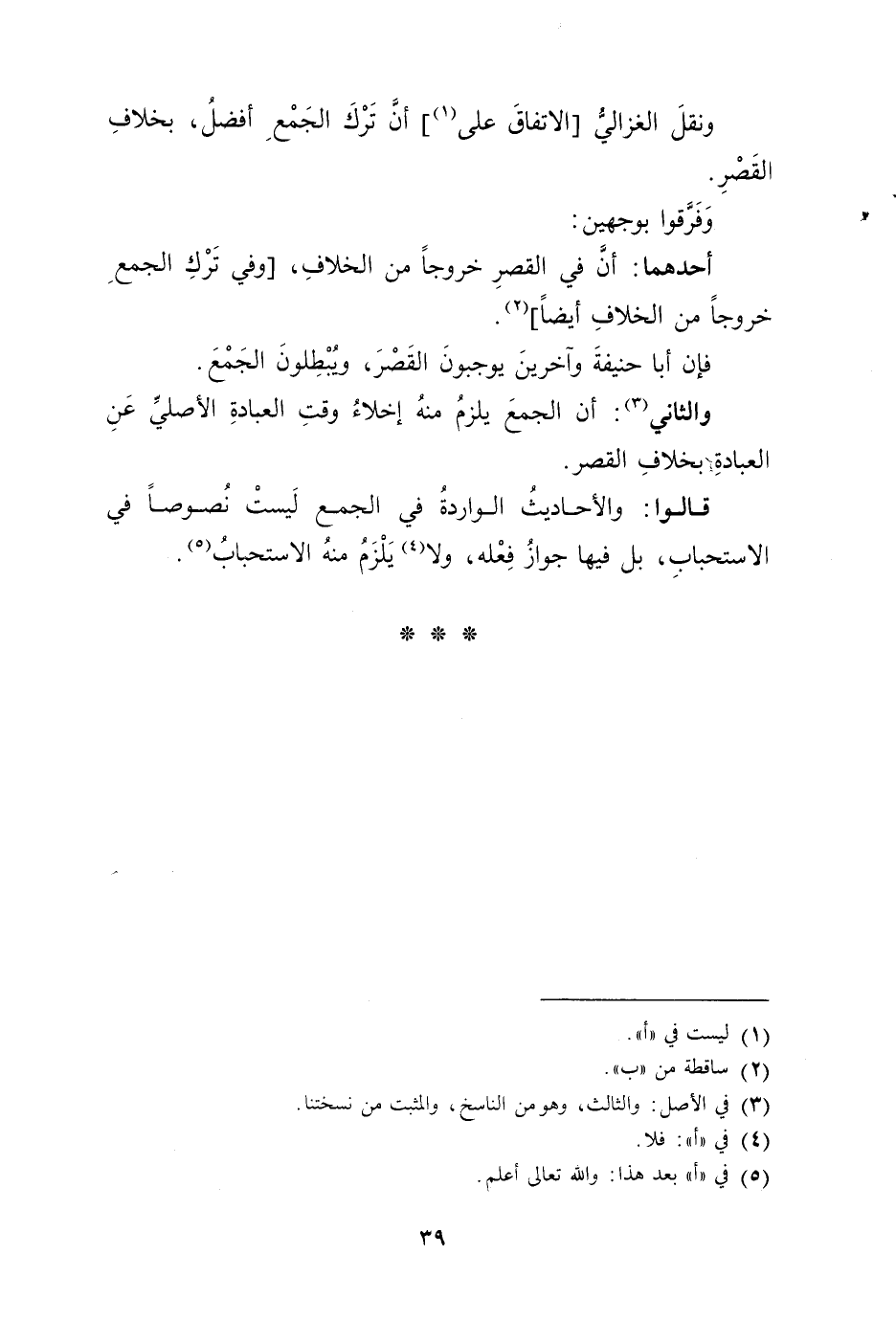 احدهما ان الْقصر خُرُوجًا من الْخلاف وَفِي ترك الْجمع خُرُوجًا من الْخلاف ايضا