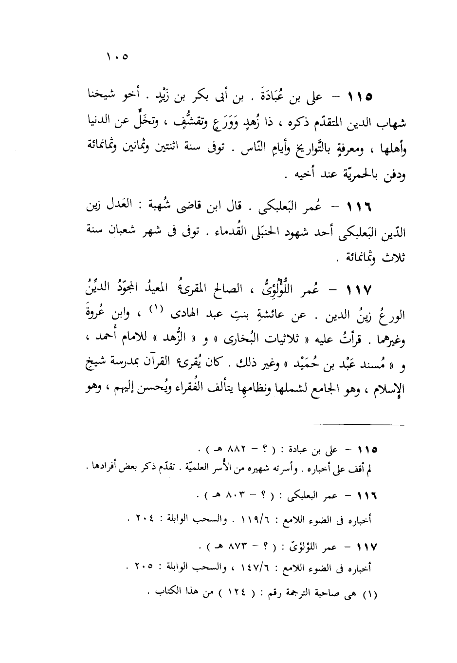 116 - عُمر البَعلبكى. قال ابن قاضى شُهبة: العَدل زين الدّين البَعلبكى أحد شهود الحنبَلى القُدماء. توفى فى شهر شعبان سنة ثلاث وثمانمائة.