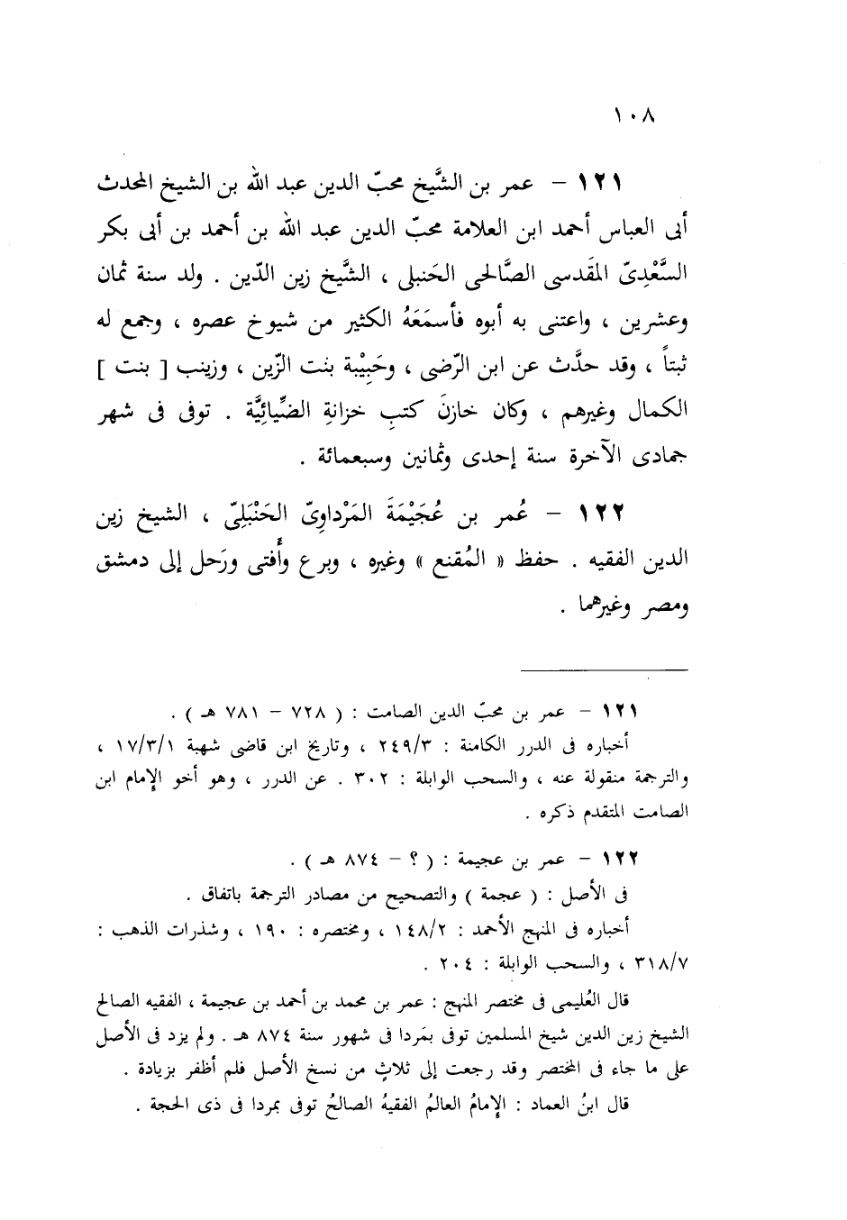 122 - عُمر بن عُجَيْمَةَ المَرْداوِىّ الحَنْبَلِىّ، الشيخ زين الدين الفقيه. حفظ "المُقنع" وغيره، وبرع وأَفتى ورَحل إلى دمشق ومصر وغيرهما.