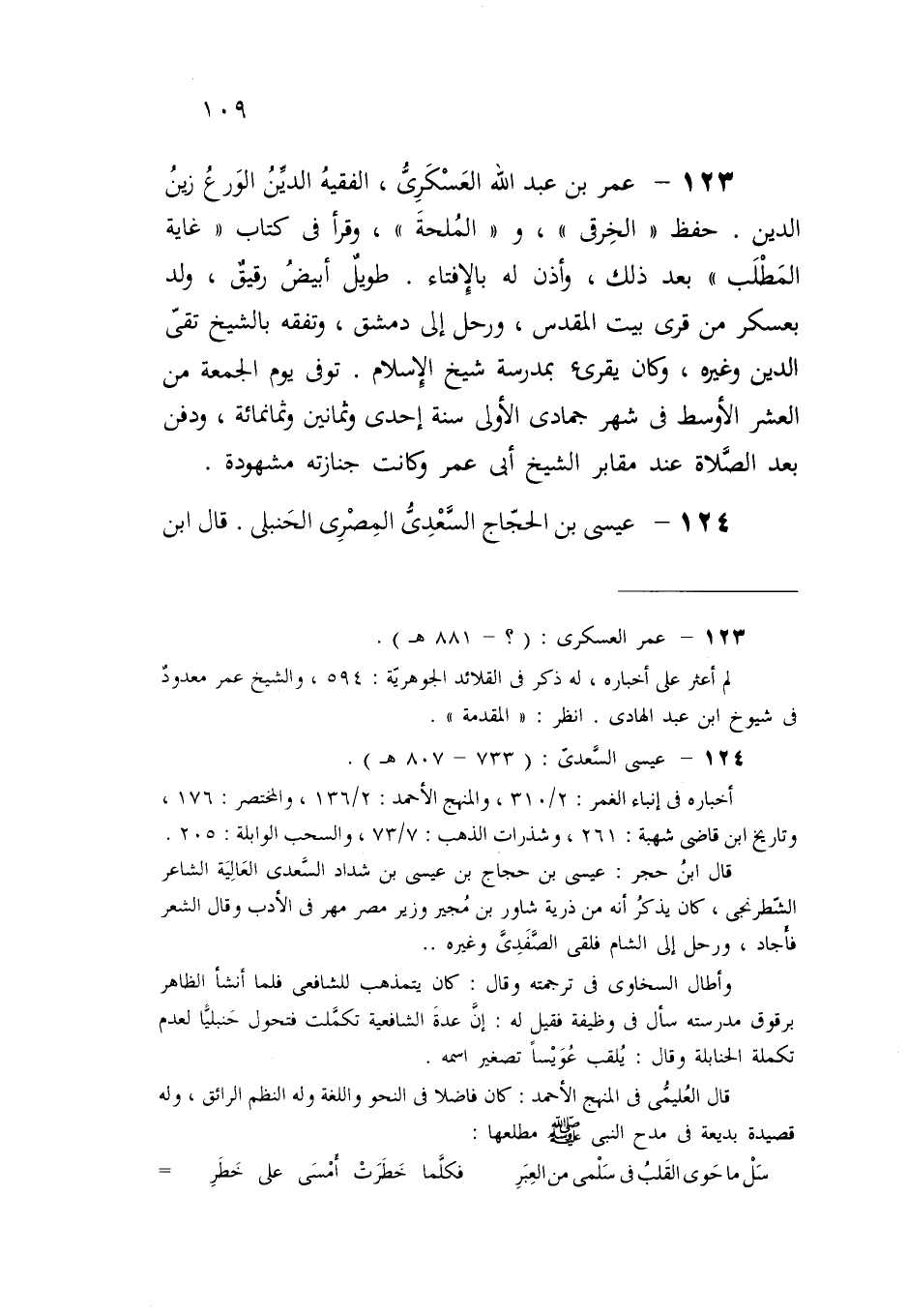 123 - عمر بن عبد الله العَسْكَرِىُّ، الفقيهُ الدينُ الوَرعُ زينُ الدين. حفظ "الخِرقى"، و"المُلحةَ"، وقرأ فى كتاب "غاية المَطْلَب" بعد ذلك، وأذن له بالِإفتاء. طويلٌ أبيضُ رقيقٌ، ولد بعسكر من قرى بيت المقدس، ورحل إلى دمشق، وتفقه بالشيخ تقيّ الدين وغيره، وكان يقرئ بمدرسة شيخ الِإسلام. توفى يوم الجمعة من العشر الأوسط فى شهر جمادى الأولى سنة إحدى وثمانين وثمانمائة، ودفن بعد الصَّلاة عند مقابر الشيخ أبي عمر وكانت جنازته مشهودة.