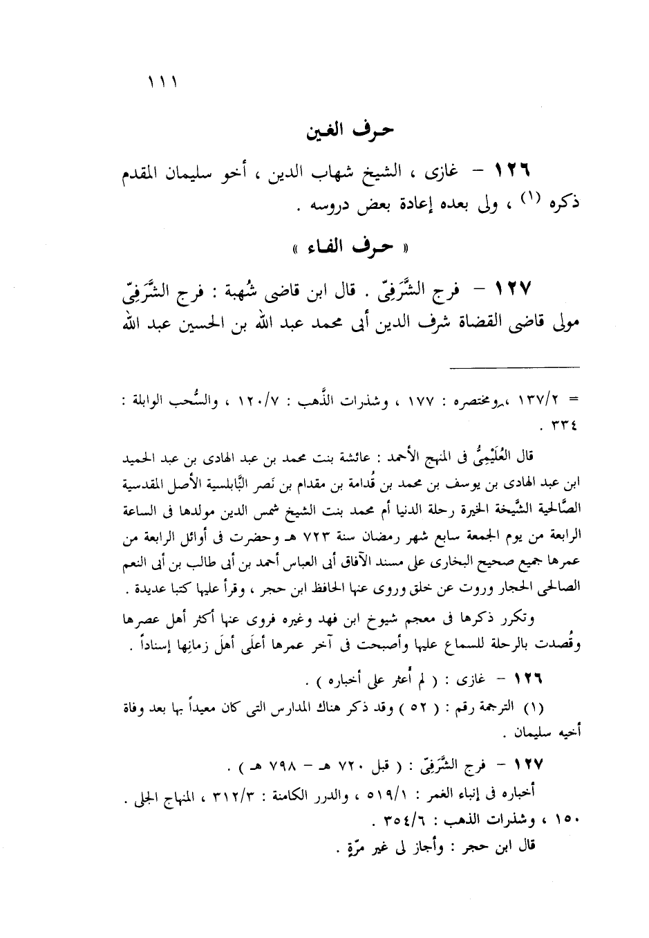 127 - فرج الشَّرَفِىّ. قال ابن قاضى شُهبة: فرج الشَّرَفِىّ مولى قاضى القضاة شرف الدين أبي محمد عبد الله بن الحسين عبد الله