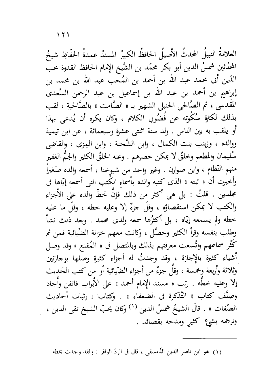العلامةُ النبيلُ المحدثُ الأصيلُ الحافظُ الكبيرُ المسندُ عمدةُ الحفّاظِ شيخُ المحدُثين شمسُ الدين أبو بكر محمّد بن الشَّيخ الِإمام الحافظ القدوة محب الدّين أبي محمد عبد الله بن أحمد بن المُحب عبد الله بن محمد بن إبراهيم بن أحمد بن عبد الله بن إسماعيل بن عبد الرحمن السَّعدى المقَدسى، ثم الصَّالحى الحنبلى الشهير بـ "الصَّامت" بالصَّالحية، لقب بذلك لكثرة سُكُوته عن فُضُولِ الكلام، وكان يكره أن يُدعى بهذا أو يلقب به بين الناس. ولد سنة اثنتى عشرة وسبعمائة، عن ابن تيمية ووالده، وزينب بنت الكمال، وابن الشَّحنة، وابن المِزى، والقاضى سُليمان والمطعم وخلقٌ لا يمكن حصرهم. وعنه الخلقُ الكثير والجمُّ الغفيرِ منهم النّظام، وابن صوارن. وغير واحد من شيوخنا، أسمعه والده صَغيرًا وأخبرت أن "ثبته" الذى كتبه والده بأسماءِ الكُتب التى أسمعه إيّاها فى مجلدين. قلتُ: بل هى أكثر من ذالك فإنَ خَطّ والده على الأجزاء والكتب لا يمكن استقصاؤه، وقلّ جزءٌ إلا وعليه خطه، وقلّ ما عليه خطه ولم يسمعه إيّاه، بل أكثرُها سمعه ولدى محمد. وبعد ذلك نشأ وطلب بنفسه وقرأ الكثير وحصَّل، وكانت معهم خزانة الضِّيائية فمن ثم كَثُر سماعهم واتَّسعت معرفتهم بذلك وبالمتصل فى "المُقنع" وقد وصل أشياء كثيرة بالِإجازة، وقد وجدتُ له أجزاء كتيرة وصلها بإجازتين وثلاثة وأربعة وخمسة، وقلَّ جزءٌ من أجزاء الضّيائية أو من كتب الحَديث إلا وعليه خطُّه. رتب "مسند الِإمام أحمد" على الأبواب فأتقن وأَجاد وصنَّف كتاب "التَّذكرة فى الضعفاء". وكتاب "إثبات أحاديث الصّفات". قالَ الشيخُ شمسُ الدين (¬1) وكان يحبّ الشيخ تقى الدين، وترجمه بشئ كثيرٍ ومدحه بقصائد.