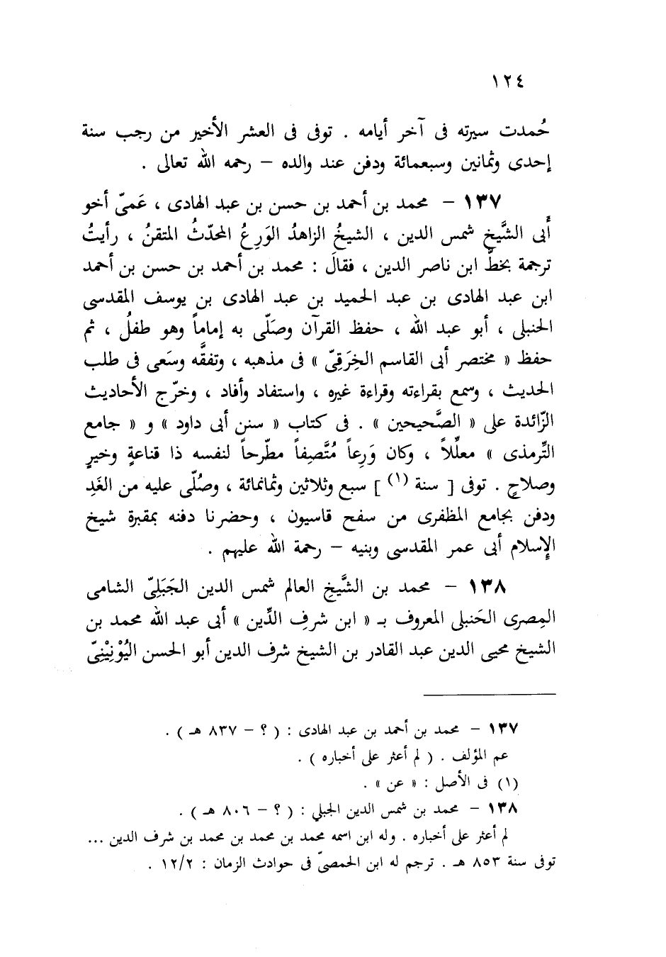 137 - محمد بن أحمد بن حسن بن عبد الهادى، عَمىّ أخو أبي الشَّيخ شمس الدين، الشيخُ الزاهدُ الوَرِعُ المحدّثُ المتقنُ، رأيتُ ترجمة بخطّ ابن ناصر الدين، فقالَ: محمد بن أحمد بن حسن بن أحمد ابن عبد الهادى بن عبد الحميد بن عبد الهادى بن يوسف المقدسى الحنبلى، أبو عبد الله، حفظ القرآن وصَلّى به إمامًا وهو طفل، ثم حفظ "مختصر أبي القاسم الخِرَقِىّ" فى مذهبه، وتفقَّه وسَعى فى طلب الحديث، وسمع بقراءته وقراءة غيره، واستفاد وأفاد، وخرّج الأحاديث الزّائدة على "الصَّحيحين". فى كتاب "سنن أبي داود" و"جامع التِّرمذى" معلِّلًا، وكان وَرِعًا مُتَّصِفًا مطرّحًا لنفسه ذا قناعةٍ وخيرٍ وصلاحِ. توفى [سنة (¬1)] سبع وثلاثين وثمانمائة، وصُلّى عليه من الغَدِ ودفن بجامع المظفرى من سفح قاسيون، وحضرنا دفنه بمقبرة شيخ الِإسلام أبي عمر المقدسى وبنيه - رحمة الله عليهم.