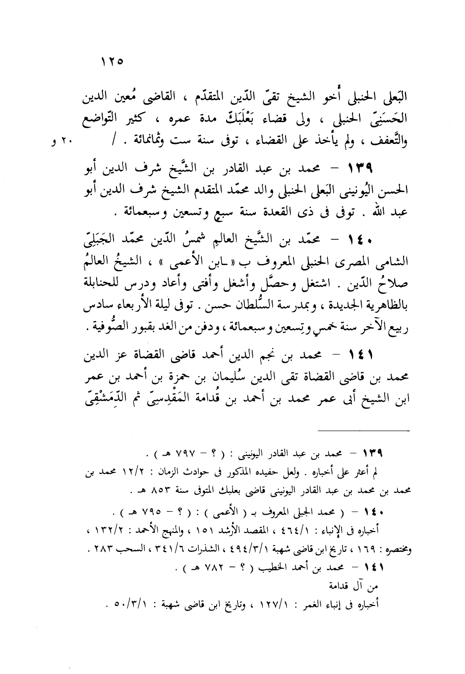 139 - محمد بن عبد القادر بن الشَّيخ شرف الدين أبو الحسن اليُونينى البَعلى الحنبلى والد محمّد المتقدم الشيخ شرف الدين أبو عبد الله. توفى فى ذى القعدة سنة سبع وتسعين وسبعمائة.