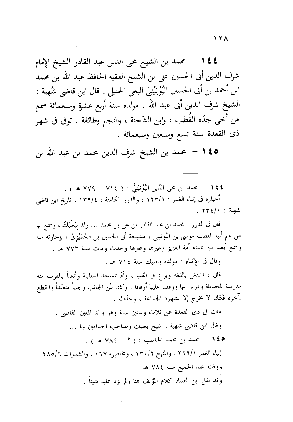144 - محمد بن الشيخ محيى الدين عبد القادر الشيخ الِإمام شرف الدين أبي الحسين علي بن الشيخ الفقيه الحافظ عبد الله بن محمد ابن أحمد بن أبي الحسين اليُوْنِيْنِىّ البعلى الحنبلى. قال ابن قاضى شُهبة: الشيخ شرف الدين أبي عبد الله. مولده سنة أربع عشرة وسبعمائة سمع من أخى جدّه القُطب، وابن الشّحنة، والنجم وطائفة. توفى فى شهر ذى القعدة سنة تسع وسبعين وسبعمائة.
