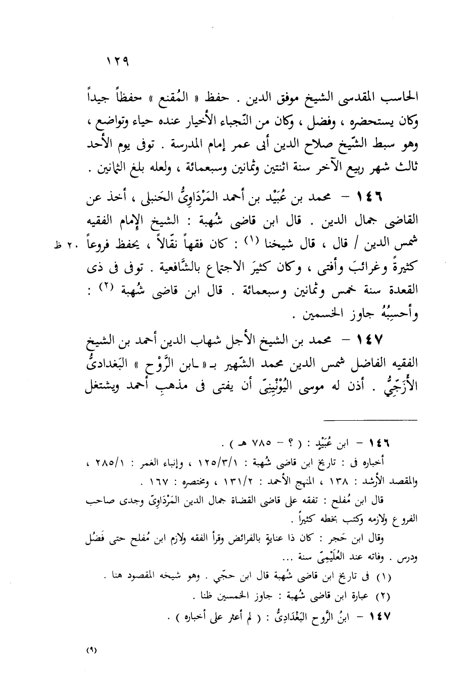146 - محمد بن عُبَيْد بن أحمد المَرْدَاوِىُّ الحَنبلى، أخذ عن القاضى جمال الدين. قال ابن قاضى شُهبة: الشيخ الِإمام الفقيه شمس الدين قال، قال شيخنا (¬1): كان فقهًا نقّالًا، يحفظ فروعًا كثيرةً وغرائبَ وأفتى، وكان كثيرَ الاجتماع بالشَّافعية. توفى فى ذى القعدة سنة خمس وثمانين وسبعمائة. قال ابن قاضى شُهبة (¬2): وأحسِبُهُ جاوز الخسمين.
