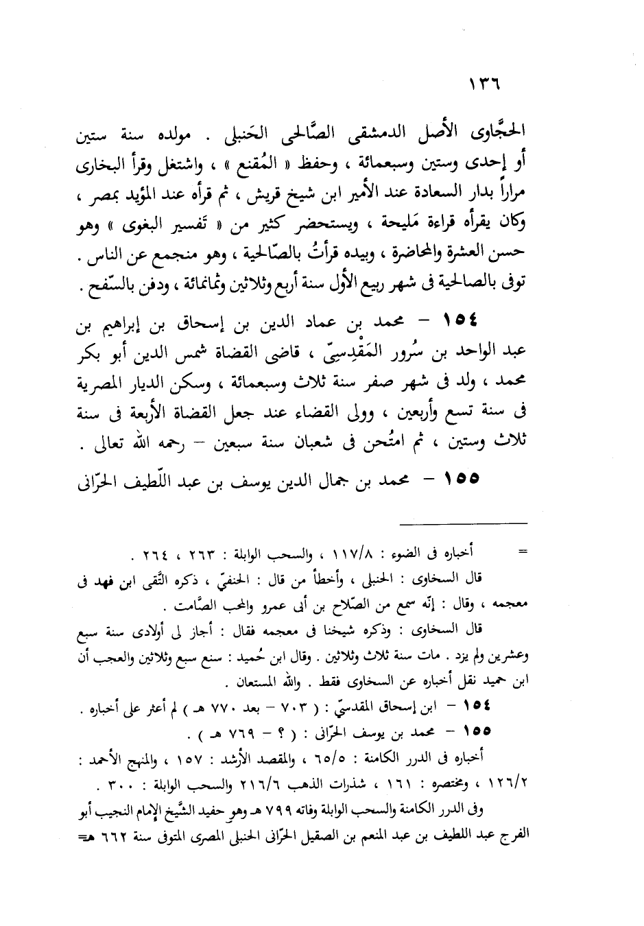154 - محمد بن عماد الدين بن إسحاق بن إبراهيم بن عبد الواحد بن سُرور المَقْدِسِى، قاضى القضاة شمس الدين أبو بكر محمد، ولد فى شهر صفر سنة ثلاث وسبعمائة، وسكن الديار المصرية فى سنة تسع وأربعين، وولى القضاء عند جعل القضاة الأربعة فى سنة ثلاث وستين، ثم امتُحن فى شعبان سنة سبعين - رحمه الله تعالى.