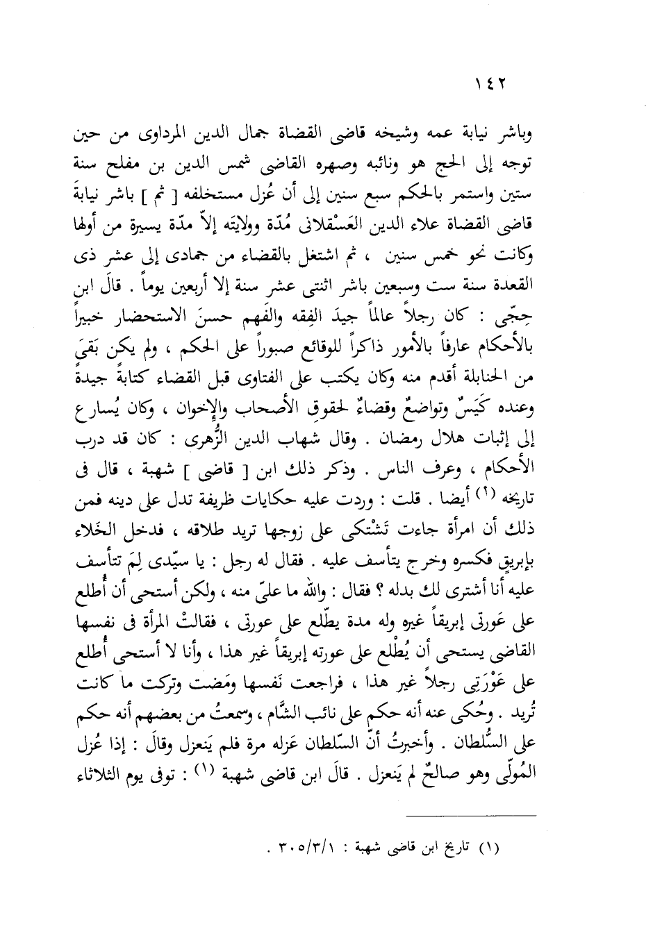 وباشر نيابة عمه وشيخه قاضى القضاة جمال الدين المرداوى من حين توجه إلى الحج هو ونائبه وصهره القاضى شمس الدين بن مفلح سنة ستين واستمر بالحكم سبع سنين إلى أن عُزل مستخلفه [ثم] باشر نيابةَ قاضى القضاة علاء الدين العَسْقلانى مُدّة وولايتَه إلاّ مدّة يسيرة من أولها وكانت نحو خمس سنين، ثم اشتغل بالقضاء من جمادى إلى عشر ذى القعدة سنة ست وسبعين باشر اثنتى عشر سنة إلا أربعين يومًا. قالَ ابنِ حِجّى: كان رجلًا عالمًا جيدَ الفِقه والفَهم حسنَ الاستحضار خبيرًا بالأحكام عارفًا بالأمور ذاكرًا للوقائع صبورًا على الحكم، ولم يكِن بَقىَ من الحنابلة أقدم منه وكان يكتب على الفتاوى قبل القضاء كتابةً جيدةً وعنده كَيَسٌ وتواضعٌ وقضاءٌ لحقوقِ الأصحاب والإخوان، وكان يُسارع إلى إثبات هلال رمضان. وقال شهاب الدين الزُّهرى: كان قد درب الأحكام، وعرف الناس. وذكر ذلك ابن [قاضى] شهبة، قال فى تاريخه (¬1) أيضًا. قلت: وردت عليه حكايات ظريفة تدل على دينه فمن ذلك أن امرأة جاءت تَشْتكى على زوجها تريد طلاقه، فدخل الخَلاء بإبريقٍ فكسره وخرج يتأسف عليه. فقال له رجل: يا سيّدى لِمَ تتأسف عليه أنا أشترى لك بدله؟ فقال: والله ما علىّ منه، ولكن أستحى أن أُطلع على عَورتى إبريقًا غيره وله مدة يطّلع على عورتى، فقالتْ المرأة فى نفسها القاضى يستحى أن يُطْلع على عورته إبريقًا غير هذا، وأنا لا أستحى أُطلع على عَوْرَتِى رجلًا غير هذا، فراجعت نَفسها ومَضت وتركت ما كانت تُريد. وحُكى عنه أنه حكم على نائب الشَّام، وسمعتُ من بعضهم أنه حكم على السُّلطان. وأخبرتُ أن السّلطان عَزله مرة فلم يَنعزل وقالَ: إذا عُزل المُوّلى وهو صالحٌ لم يَنعزل. قالَ ابن قاضى شهبة (1): توفى يوم الثلاثاء