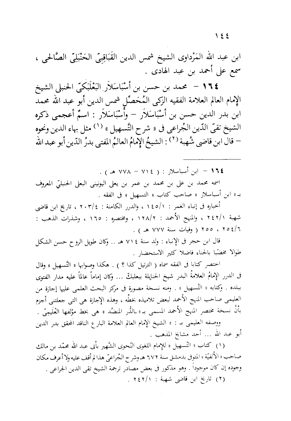 164 - محمد بن حسن بن أسْبَاسَلاَر البَعْلَبَكىّ الحنبلى الشيخ الِإمام العالم العلامة الفقيه الزكى المُحَصِّل شمس الدين أبو عبد الله محمد ابن بدر الدين حسن بن أسْبَاسَلاَر - وأَسْبَاسَلاَر: اسمٌ أعجمى ذكره الشيخ تقىّ الدّين الجُراعى فى "شرح التَّسهيل" (¬1) مثل بهاء الدين ونحوه - قال ابن قاضى شُهبة (¬2): الشيخ الِإمامُ العالمُ المفتى بدرُ الدّين أبو عبد الله