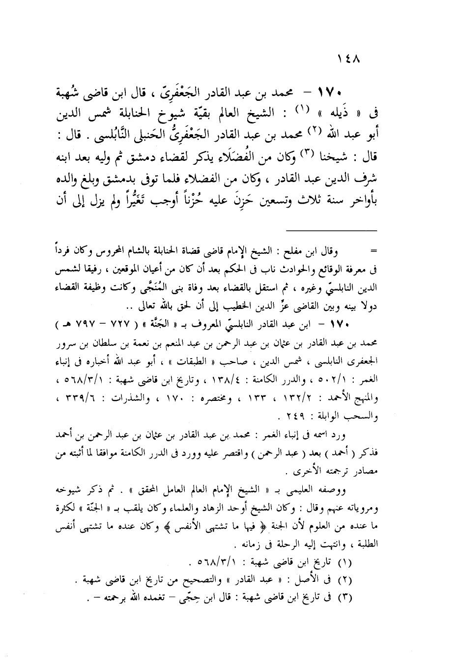 170 - محمد بن عبد القادر الجَعْفَرِىّ، قال ابن قاضى شُهبة فى "ذَيله" (¬1): الشيخ العالم بقيّة شيوخ الحنابلة شمس الدين أبو عبد الله (¬2) محمد بن عبد القادر الجَعْفَرِىُّ الحَنبلى النَّابُلسى. قال: قال: شيخنا (¬3) وكان من الفُضَلَاء يذكر لقضاء دمشق ثم وليه بعد ابنه شرف الدين عبد القادر، وكان من الفضلاء فلما توفى بدمشق وبلغ والده بأواخر سنة ثلاث وتسعين حَزِنَ عليه حُزْنًا أوجب تَغَيُّرًا ولم يزل إلى أن