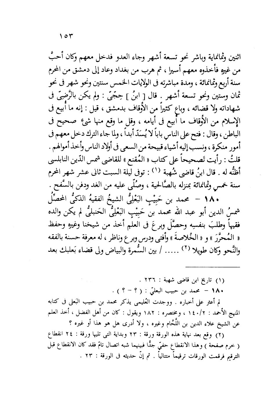 180 - محمد بن حَبِيْبٍ البَعْلِىُّ الشيخُ الفقيهُ الذكىُّ المحصِّلُ شمسُ الدين أبو عبد الله محمد بن حَبِيْبٍ البَعْلِىُّ الحَنبلىُّ لم يكن والده فقيهًا وطلبَ بنفسِه وحصَّلَ وبرعَ فى العلمِ أخذ من شيخنا وغيره وحفظ "المُحرَّرَ" و"الخُلاصةَ" وأفتى ودرس وبرع وناظر، له معرفة حسنة بالفقه والنَّحو وكان طويلا (¬2). . . . . بين السُّمرة والبياض ولى قضاء بَعلبك بعد