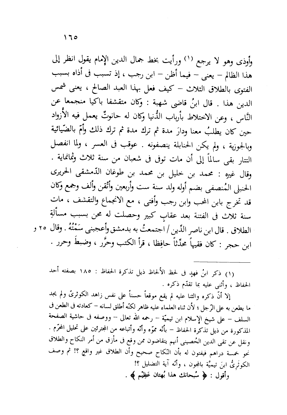 إلا أنّ ذكره والثنا عليه لم يقع موقعًا حسنًا على نفس زاهد الكوثرىّ ولم يجد ما يطعن به على الرّجل، لأن ثناء العلماء عليه ظاهر لكنه أطلق لسانه - كعادته في الطعن في السلف - على شيخ الإسلام ابن تيمية - رحمه الله تعالى - ووصفه في حاشية الصفحة المذكورة من ذيل تذكرة الحفاظ - بأنّه مموّه وأَنَّه وأتباعه من المجترئين على تحليل المحرّم. ونقل عن تقى الدين الحُصينى أنهم يتقاضون ممن وقع في مأزق من أمر النكاح والطلاق نحو خمسة دراهم فيفتون له بأن النكاح صحيح وأن الطلاق غير واقعٍ؟! ثم وصف الكوثَرِىَ ابنَ تيميَّة بالمجون، وأنه آية التضليل؟!
