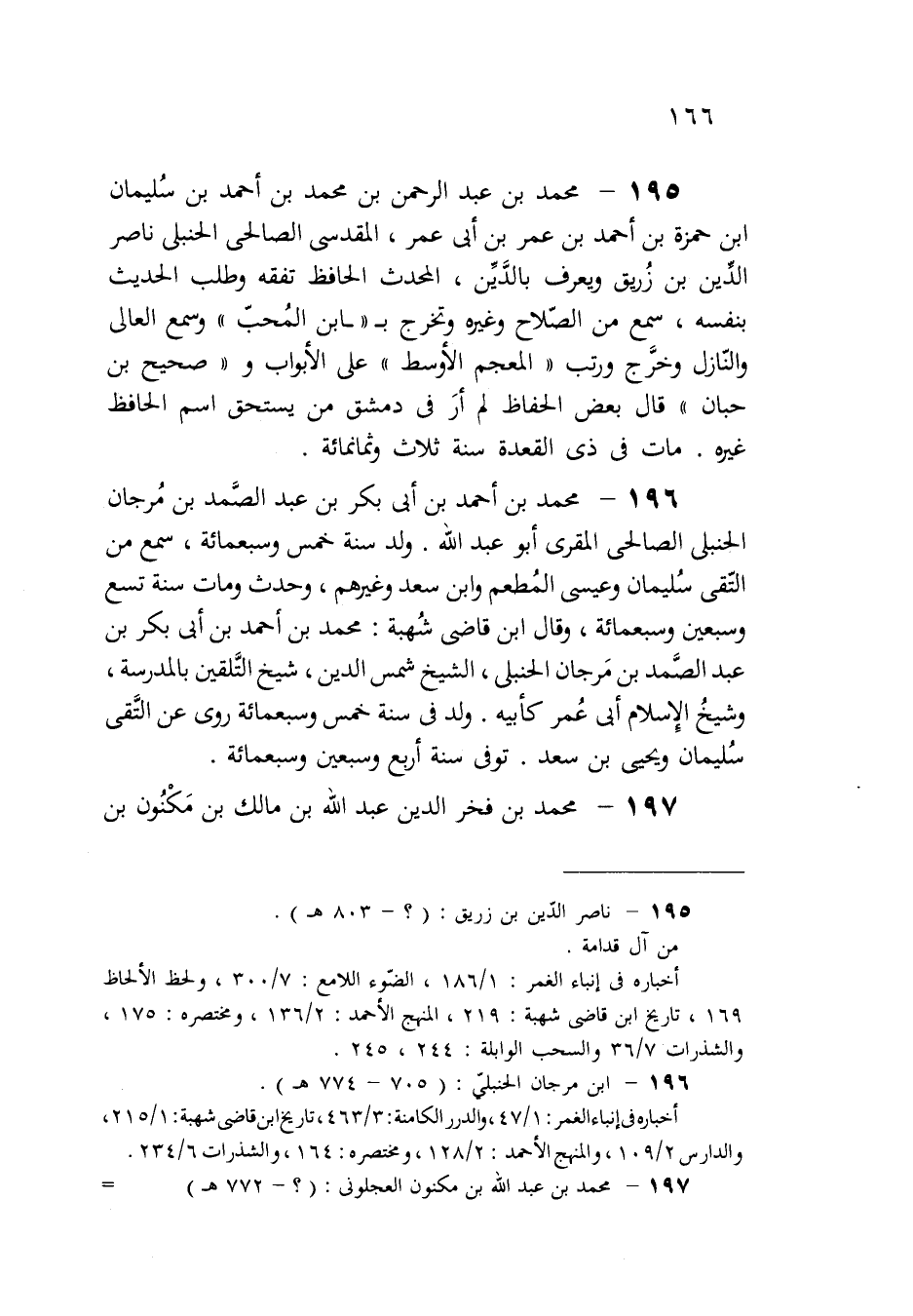 195 - محمد بن عبد الرحمن بن محمد بن أحمد بن سُليمان ابن حمزة بن أحمد بن عمر بن أبى عمر، المقدسي الصالحى الحنبلى ناصر الدِّين بن زُريق ويعرف بالدَّيِّن، المحدث الحافظ تفقه وطلب الحديث بنفسه، سمع من الصّلاح وغيره وتخرج بـ "ـابن المُحبّ" وسمع العالى والنّازل وخرَّج ورتب "المعجم الأوسط" على الأبواب و"صحيح بن حبان" قال بعض الحفاظ لم أرَ في دمشق من يستحق اسم الحافظ غيره. مات في ذى القعدة سنة ثلاث وثمانمائة.