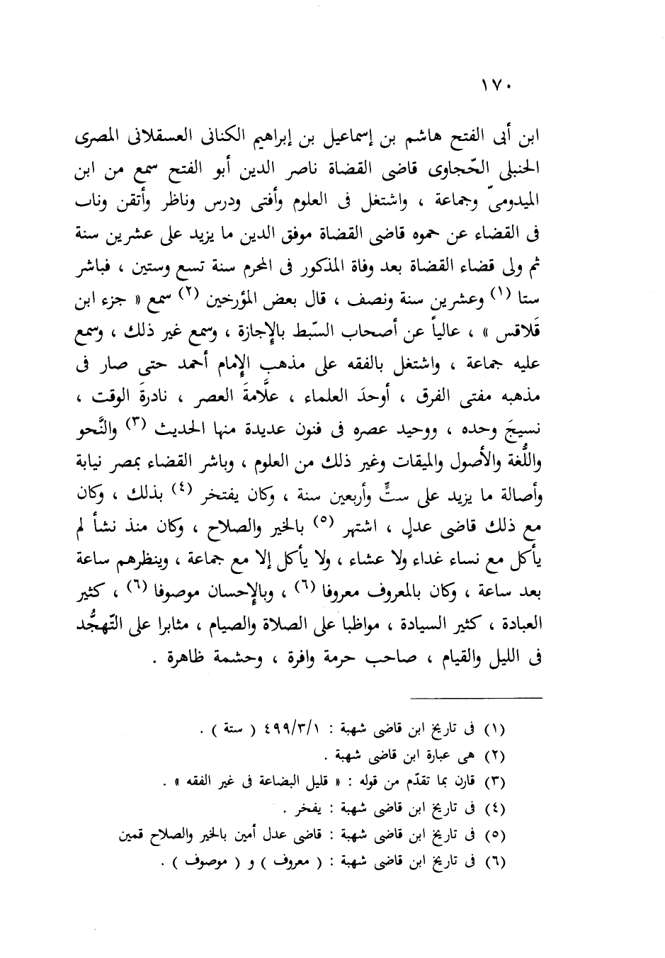 ابن أبى الفتح هاشم بن إسماعيل بن إبراهيم الكنانى العسقلانى المصري الحنبلى الحّجاوى قاضي القضاة ناصر الدين أبو الفتح سمع من ابن الميدومىّ وجماعة، واشتغل في العلوم وأفتى ودرس وناظر وأتقن وناب في القضاء عن حموه قاضي القضاة موفق الدين ما يزيد على عشرين سنة ثم ولى قضاء القضاة بعد وفاة المذكور في المحرم سنة تسع وستين، فباشر ستا (¬1) وعشرين سنة ونصف، قال بعض المؤرخين (¬2) سمع "جزء ابن قَلاقس"، عاليًا عن أصحاب السَّبط بالإِجازة، وسمع غير ذلك، وسمع عليه جماعة، واشتغل بالفقه على مذهب الإمام أحمد حتَّى صار في مذهبه مفتى الفرق، أوحدَ العلماء، علَّامةَ العصر، نادرةَ الوقت، نسيجَ وحده، ووحيد عصره في فنون عديدة منها الحديث (¬3) والنَّحو واللُّغة والأصول والميقات وغير ذلك من العلوم، وباشر القضاء بمصر نيابة وأصالة ما يزيد على ستَّ وأربعين سنة، وكان يفتخر (¬4) بذلك، وكان مع ذلك قاضى عدلٍ، اشتهر (¬5) بالخير والصلاح، وكان منذ نشأ لم يأكل مع نساء غداء ولا عشاء، ولا يأكل إلا مع جماعة، وينظرهم ساعة بعد ساعة، وكان بالمعروف معروفا (6)، وبالإحسان موصوفا (¬6)، كثير العبادة، كثير السيادة، مواظبا على الصلاة والصيام، مثابرا على التّهجُّد في الليل والقيام، صاحب حرمة وافرة، وحشمة ظاهرة.