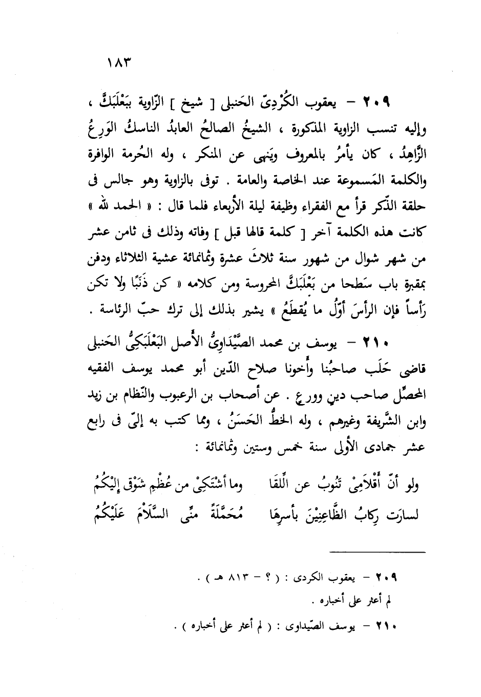 209 - يعقوب الكُرْدِىّ الحَنبلى [شيخ] الزّاوية ببَعْلَبَكَّ، وإليه تنسب الزاوية المذكورة، الشيخُ الصالحُ العابدُ الناسكُ الوَرِعُ الزَّاهِدُ، كان يأمرُ بالمعروف ويَنهى عن المنكر، وله الحُرمة الوافرة والكلمة المَسموعة عند الخاصة والعامة. توفى بالزاوية وهو جالس في حلقة الذِّكر قرأ مع الفقراء وظيفة ليلة الأربعاء فلما قال: "الحمد لله" كانت هذه الكلمة آخر [كلمة قالها قبل] وفاته وذلك في ثامن عشر من شهر شوال من شهور سنة ثلاثَ عشرة وثمانمائة عشية الثلاثاء ودفن بمقبرة باب سَطحا من بَعلَبَكَّ المحروسة ومن كلامه "كن ذَنَبًا ولا تكن رَأسًا فإن الرأسَ أوّلُ ما يُقطَعُ" يشير بذلك إلى ترك حبّ الرئاسة.