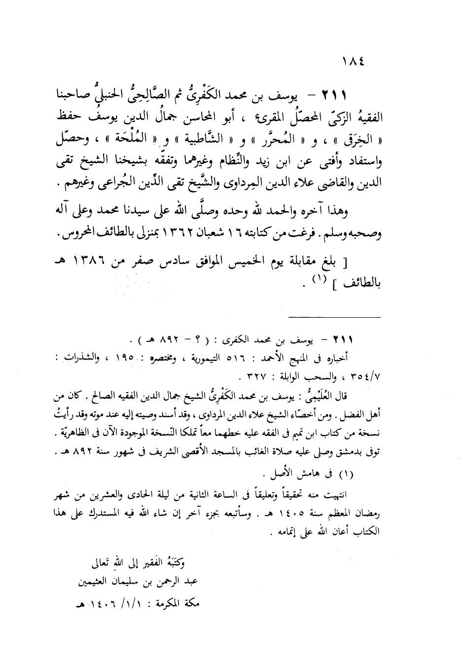 211 - يوسف بن محمد الكَفْرِىُّ ثم الصَّالِحِىُّ الحنبلىُّ صاحبنا الفقيهُ الزكىّ المحصّلُ المقرئ، أبو المحاسن جمالُ الدين يوسفُ حفظ "الخِرَقى"، و"المُحرَّر" و "الشَّاطبية" و "المُلْحَة"، وحصّل واستفاد وأفتى عن ابن زيد والنِّظام وغيرهما وتفقه بشيخنا الشيخ تقى الدين والقاضى علاء الدين المِرداوى والشَّيخ تقى الدِّين الجُراعى وغيرهم.