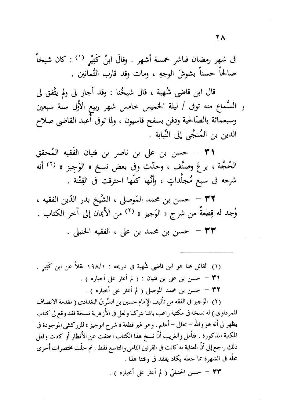 32 - حسن بن محمد المَوصلى، الشَّيخ بدر الدّين الفقيه، وُجد له قِطعةٌ من شرحِ "الوَجيز" (2) من الأيمان إلى آخر الكتاب.