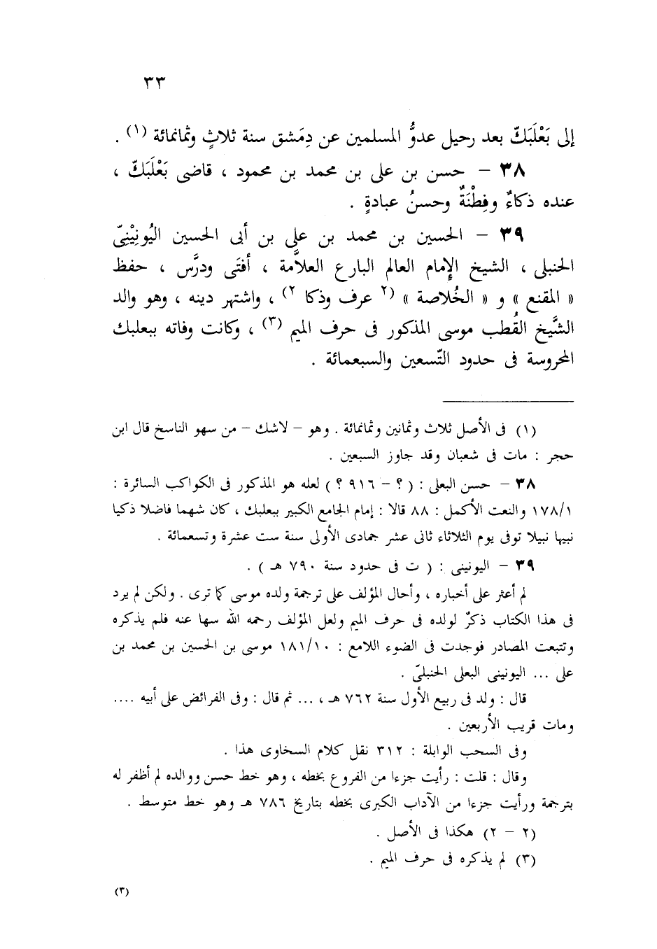 38 - حسن البعلى: (؟ - 916؟) لعله هو المذكور في الكواكب السائرة: 1/ 178 والنعت الأكمل: 88 قالا: إمام الجامع الكبير ببعلبك، كان شهما فاضلاً ذكياً نبيها نبيلا توفى يوم الثلاثاء ثانى عشر جمادى الأولى سنة ست عشرة وتسعمائة.
