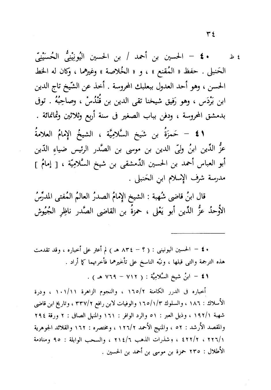 41 - ابنُ شيخ السلامِيَّة: (712 - 769 هـ). أخباره في الدرر الكامنة 2/ 165، والنجوم الزاهرة 11/ 101، ودرة الأسلاك: 186، والسلوك 3/ 1 / 165 والوفيات لابن رافع 2/ 337، وتاريخ ابن قاضى شهبة 1/ 192، وذيل العبر: 51 والرد الوافر: 161 والمنهل الصافى: 2 ورقة 294 والمقصد الأرشد: 52، والمنهج الأحمد 2/ 126، ومختصره: 162 والقلائد الجوهرية 226/ 1، 2/ 422، وشذرات الذهب 6/ 214، والسحب الوابلة: 95 ومنادمة الأطلال: 235 حمزة بن موسى بن أحمد بن الحسين.