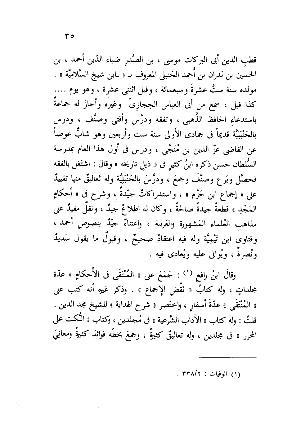 قطبِ الدين أبي البركات موسى، بن الصدرِ ضياء الدّين أحمد، بن الحسين بن بَدران بن أحمد الحَنبلى المعروف بـ "ــابن شيخِ السَّلامِية". مولده سنة ستَّ عشرةَ وسبعمائة، وقيل اثنتى عشرة، وهو يوم ... . كذا قيل، سمع من أبي العباس الحِجازِىّ وغيره وأجازَ له جماعة باستدعاءِ الحافظ الذَّهبى، وتفقَّه ودرَّس وأفتى وصنَّف، ودرس بالحَنْبَلِية قديماً في جمادى الأولى سنة ست وأربعين وهو شاب عوضًا عن القاضي عزّ الدين بن مُنَجَّى، ودرس في أول هذا العام بمدرسة السُّلطان حسن ذكرهِ ابنُ كثير في "ذيلِ تاريخه" وقال: اشتَغل بالفقه فحصل وبَرع وصنَّف وجمعَ، ودرَّسَ بالحَنْبَلِية وله تَعاليق منها تقييد على "إجماع ابن حَزْم"، واستدراكات جيّدة، وشرح في "أحكام المَجْدِ" قطعةً جيدة صالحةً، وكان له اطلاع جيد، ونقل مفيد على مذاهبِ العُلماء المَشهورة والعَربية، واعتناءٌ جيّد بنصوص أحمد، وفتاوى ابن تَيْمِيَّة وله فيه اعتقاد صحيح، وقبولٌ ما يقول سَديد ونُصرة، ويُوالى عليه ويُعادى فيه.