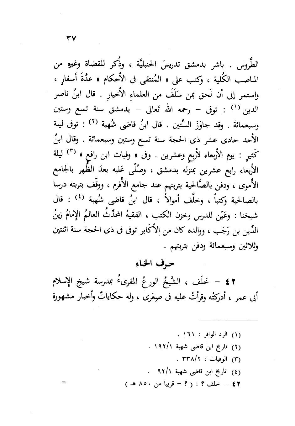 الطروس. باشر بدمشق تدريسَ الحنبليَّة، وذُكر للقضاة وغيره من المناصب الكُلية، وكتب على "المُنتقى في الأحكام" عدَّةَ أسفارٍ، واستمر إلى أن لَحق بمن سَلَفَ من العلماءِ الأخيارِ. قال ابنُ ناصر الدين (¬1): توفى - رحمه الله تَعالى - بدمشق سنة تسع وستين وسبعمائة. وقد جاوَزَ السِّتين. قال ابنُ قاضى شُهبة (¬2): توفى ليلة الأحد حادى عشر ذى الحجة سنة تسع وستين وسبعمائة. وقال ابنُ كَثيرٍ: يوم الأربعاء لأربع وعشرين. وفى "وفيات ابن رافع" (¬3) ليلة الأربعاء رابع عشرين بمنزله بدمشق، وصُلّى عَليه بعدَ الظهر بالجامع الأموى، ودفن بالصالحية بتربتهم عند جامع الأفرم، ووقّف بتربته درسا بالصالحية وكتباً، وخلف أموالاً، قال ابنُ قاضى شُهبة (¬4): قال شيخنا: وعَيّن للدرس وخزن الكتب، الفقيهُ المحدثُ العالمُ الإمامُ زينُ الدِّين بن رَجَب، ووالده كان من الأكَابر توفى في ذى الحجة سنة اثنتين وثلاثين وسبعمائة ودفن بتربتهم.