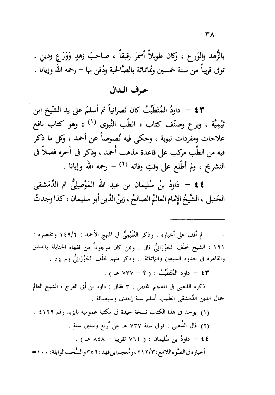 43 - داودُ المُتَطببُ كان نَصرانياً ثم أسلمَ على يد الشّيخ ابن تَيْمِيَّة، وبرع وصنّف كتاب "الطّب النَّبوى (¬1) " وهو كتاب نافعٌ علاجات ومفردات نبوية، وحكى فيه نُصوصاً عن أحمد، وكل ما ذكر فيه من الطب مركب على قاعدة مذهب أحمد، وذكر في آخره فصلاً في التشريح، ولم أطّلع على وقتِ وفاته (¬2) - رحمه الله وإيانا.