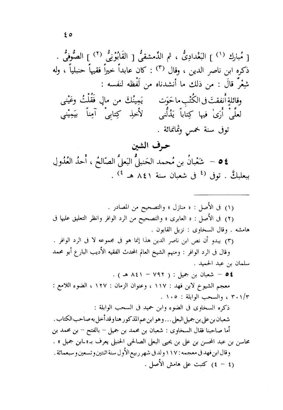 54 - شَعْبانُ بن مُحمد الحَنبلى البَعلىّ الصالحُ، أحدُ العُدُولِ ببعلبك. توفى (4 في شعبان سنة 841 هـ 4).