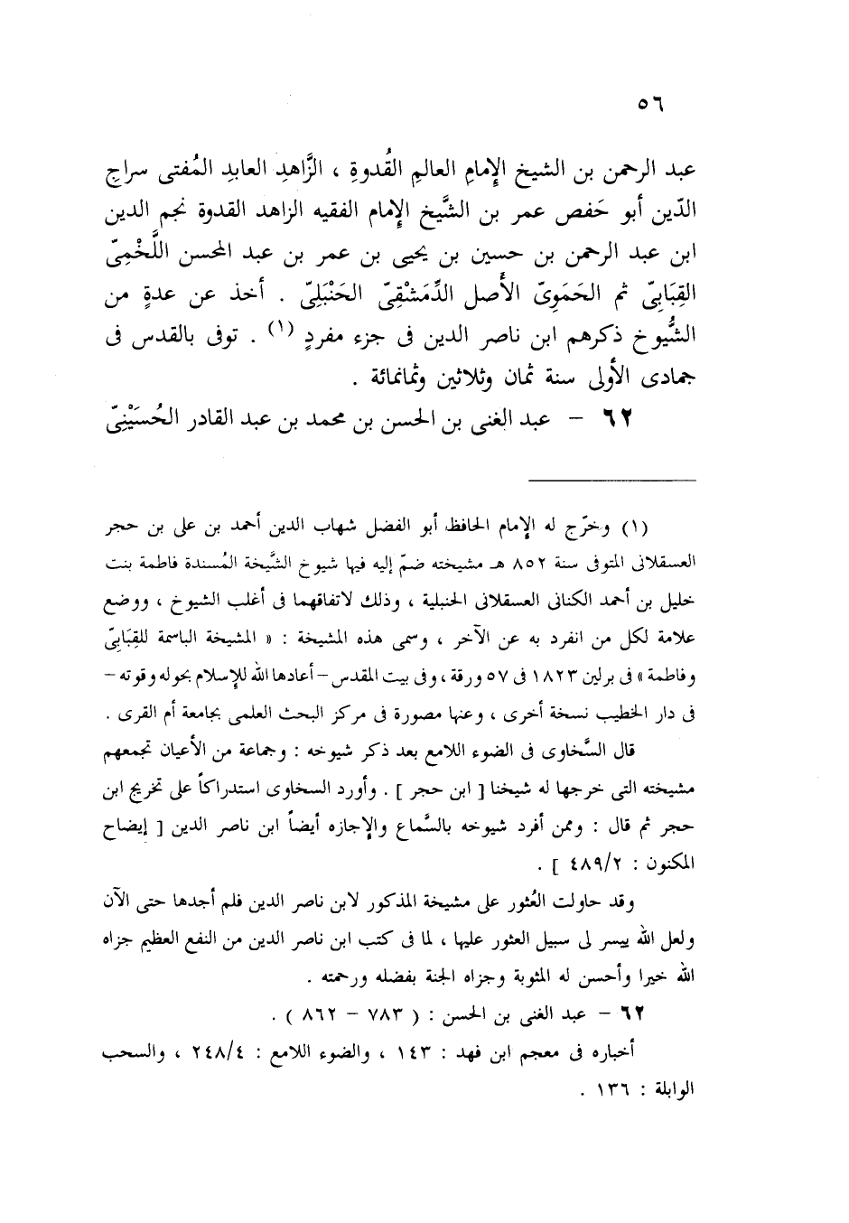 عبد الرحمن بن الشيخ الإمام العالمِ القُدوةِ، الزَّاهدِ العابدِ المُفتى سراجِ الذين أبو حَفص عمر بن الشَّيخ الِإمام الفقيه الزاهد القدوة نجم الدين ابن عبد الرحمن بن حسين بن يحيى بن عمر بن عبد المحسن اللَّخْمِىّ القِبَابِى ثم الحَمَوِي الأصل الدَّمَشْقِيّ الحَنْبَلِيّ. أخذ عن عدةٍ من الشُّيوخ ذكرهم ابن ناصر الدين فى جزء مفردٍ (¬1). توفى بالقدس فى جمادى الأولى سنة ثمان وثلاثين وثمانمائة.